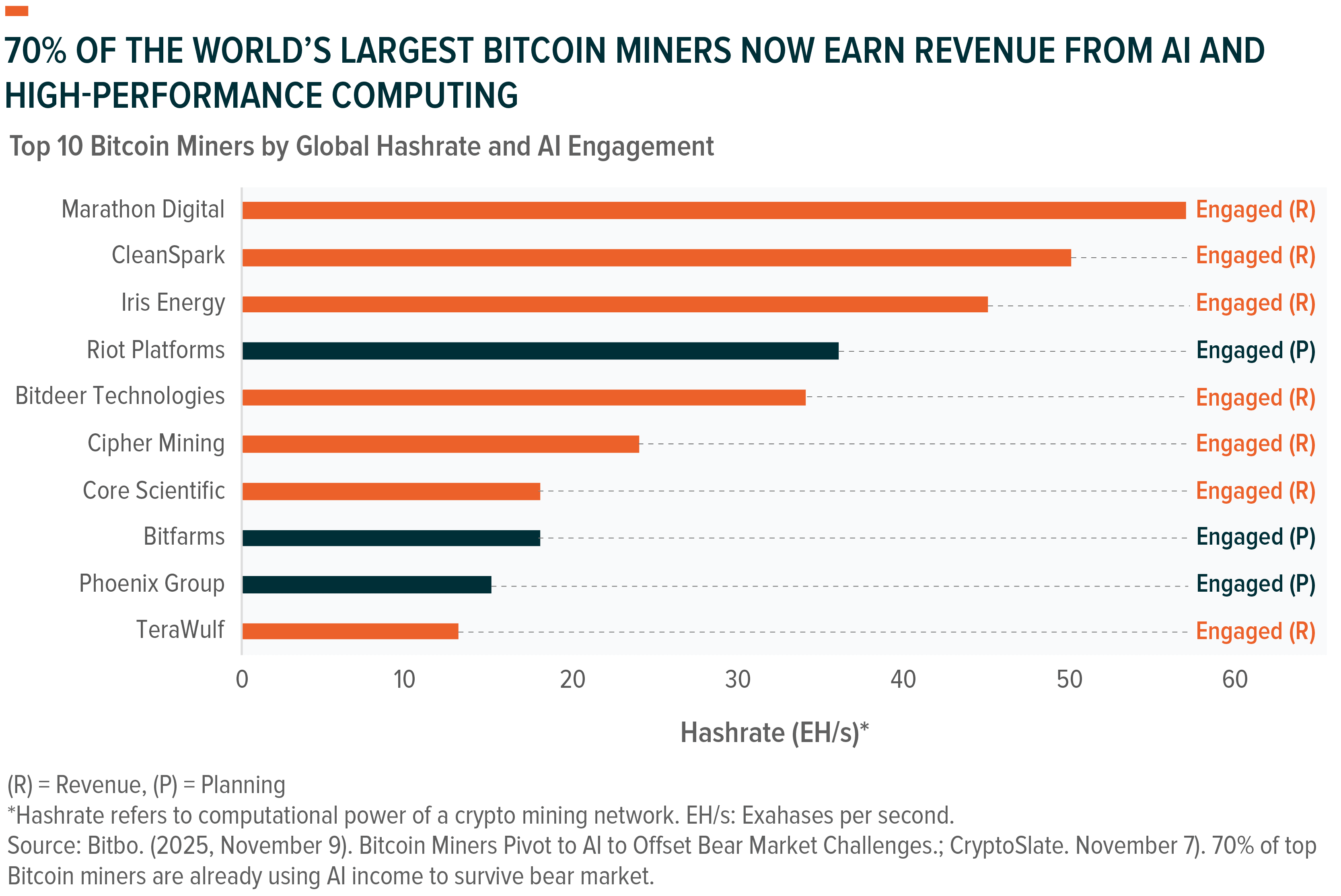 In this evolving landscape, scale and infrastructure optionality are becoming strategic differentiators. Larger miners are increasingly able to attract capital, secure chip allocations, and sign long-term enterprise contracts, fueling consolidation and accelerating revenue growth. Miners also have access to power, a strategic lever given the broader AI buildout’s electricity bottlenecks.