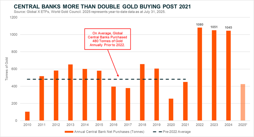 Central banks, for example, once largely passive “price takers” in the gold market with minimal influence, have emerged as a dominant market force. Prior to 2022, global reserve banks consistently and passively accumulated around 500 tonnes of gold annually. Since Russia’s invasion of Ukraine and the US’s confiscation of US$300 billion in Russian assets, however, they have more than doubled their hedging activity – buying over 1,000 tonnes of gold a year, worth roughly US$133 billion at today’s prices.1 Analysts predict that 2025 will mark the fourth straight year of central bank buying at this extraordinary pace.2 Indeed, what was once a quiet, background flow of demand has become a decisive driver of price formation, widely seen as laying a structural floor beneath gold.