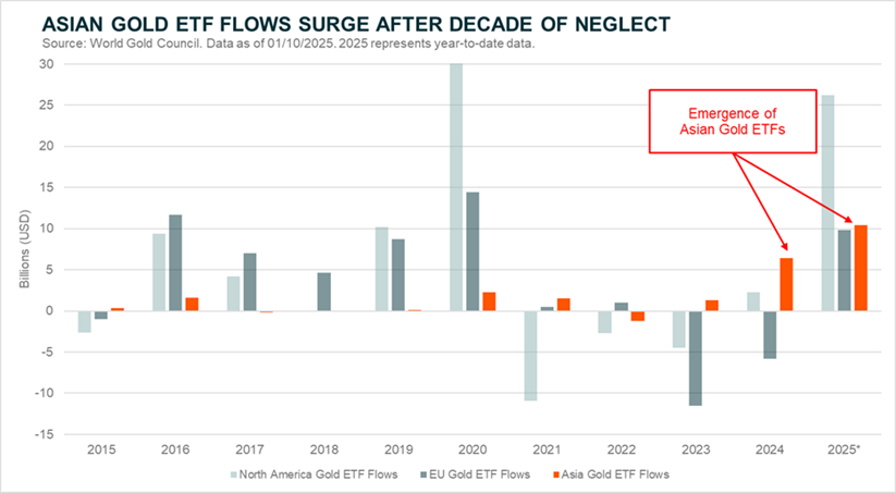 In the ETF space, a whole new cohort of investors has stepped forward to reshape market dynamics. Asian investors – historically absent from the centre of gold price formation – have emerged as pivotal players, with their growing allocations tilting the balance of influence away from traditional Western buyers.