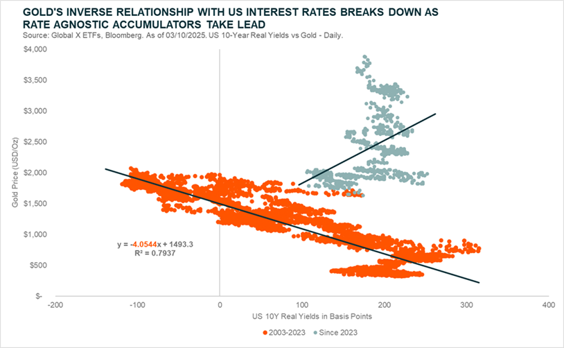 - New entrants to the gold market – namely Chinese ETF investors and central banks – were key drivers of gold’s outperformance between 2023 and early 2025, while traditional price catalysts played a secondary role.