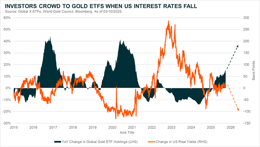 The effect is well studied and statistically robust, with historical regression over the past 20 years (2003-2023) showing that every 1% fall in real yields correlates roughly with a $400 increase in gold price.3 The relationship had weakened between 2023-2025, initially confusing investors, but with hindsight and the context provided (i.e. central banks, Asian ETF investors), it makes sense how gold was able to defy higher rates and still outperform. Now, as the US Fed reinitiates its rate cut cycle, we expect the traditionally inverse relationship between interest rates and gold price to resume. Further, Western investors, who have long relied on Fed rate cuts as a signal to buy gold may look to return to the market after multiple years of absence and provide a powerful tailwind for the next leg higher.