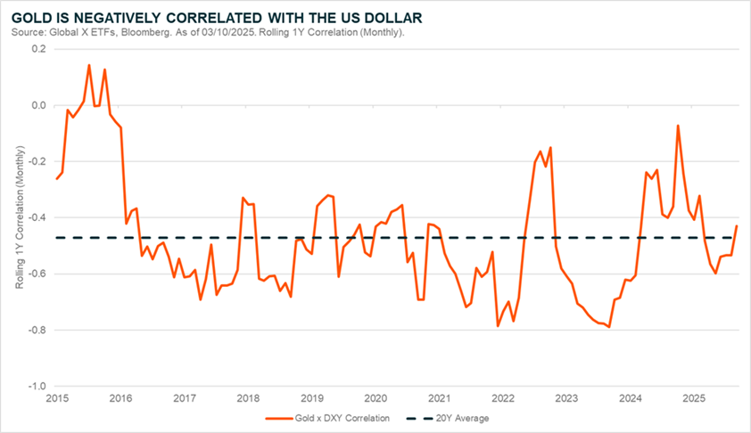 However, long-term investors weighing currency-hedged versus unhedged gold exposure must ultimately balance two competing scenarios: the risk of macroeconomic or policy shocks versus the likelihood of a sustained “goldilocks” phase of growth and normalisation. The former typically favours unhedged exposure, as gold and the US dollar tend to strengthen together during periods of stress, while the latter generally supports a hedged approach as risk appetite and the Australian dollar recover.