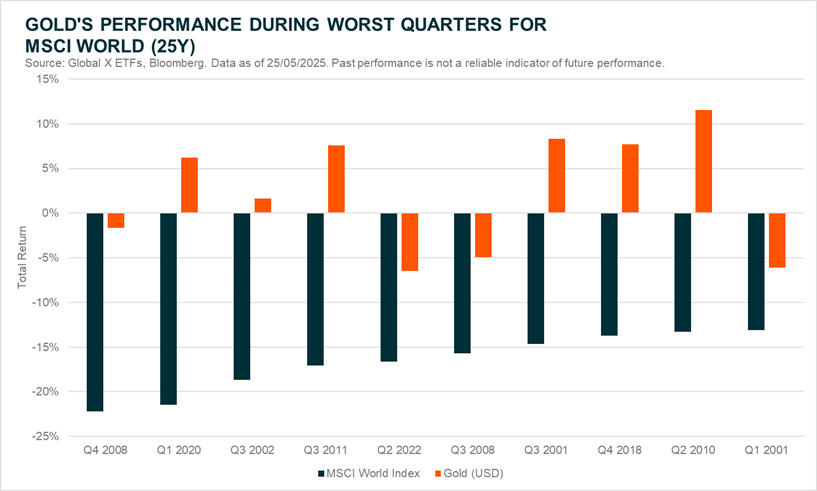 As inflation and growth concerns remain front of mind for global investors, gold’s relevance in portfolios continues to stand out. Historically, gold has proven to be one of the most effective hedges against periods of economic slowdown, showing low to negative correlation with equities during sustained market sell-offs.
