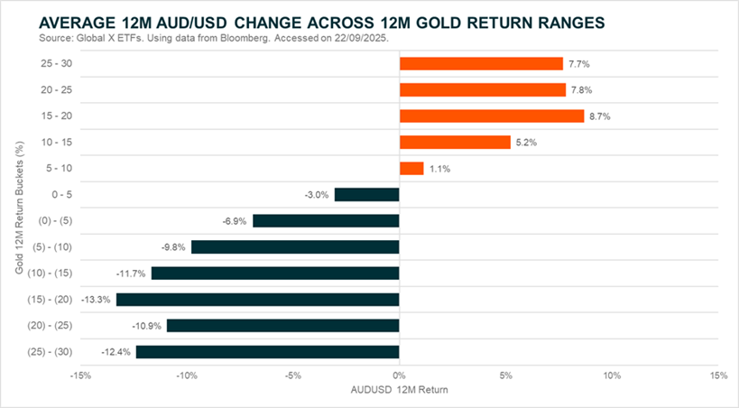 While non-currency hedged gold exposure has undoubtedly been the better investment over the long run, there is evidence that Australian investors, in particular, may benefit from currency hedging tactically.5 Historical analysis shows that the correlation between the Australian dollar (in context of the AUDUSD pair) and gold prices is mildly positive, with the average correlation sitting at 0.26 over the past 25 years.6 Stronger gold bull markets (i.e. 10-30% annual returns) also tend to coincide with periods of AUD appreciation against the US dollar, meaning currency-hedged investors can outperform during these rallies.