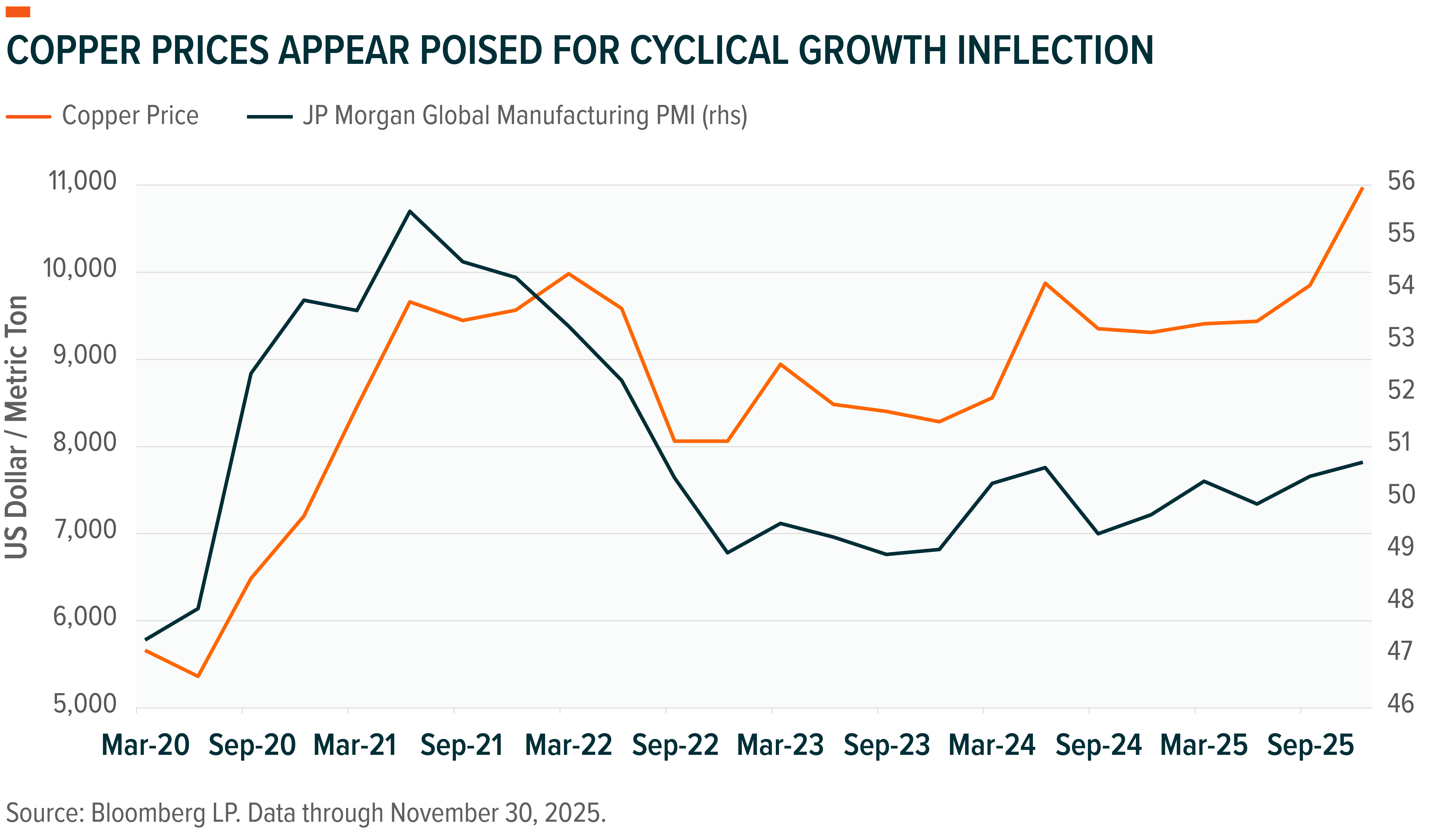 We believe copper’s investment thesis has materially changed, with the evolving supply-demand dynamics likely pushing the metal’s trading range structurally higher over time, which would greatly benefit current producers of the metal. Copper’s rise to all-time highs in 2025 showcased the metal’s increasing resilience, with quickly growing structural demand and weak mine supply growth offsetting cyclical demand stagnation. Looking ahead in 2026, we see a mix of fundamental and macro factors driving the market into a modest deficit, which could potentially further support prices. Beyond copper, we see persistent inflation, rising sovereign debt levels, and worsening demographics highlighting the important role hard assets, such as commodities, play within a portfolio. Yet not all commodities are the same, underscoring the need to allocate to goods with more favorable long-term backdrops. In this context, copper and particularly copper miners, stand out to us as an effective allocation to capitalize on the long-term benefits of portfolio diversification that commodities have historically provided.