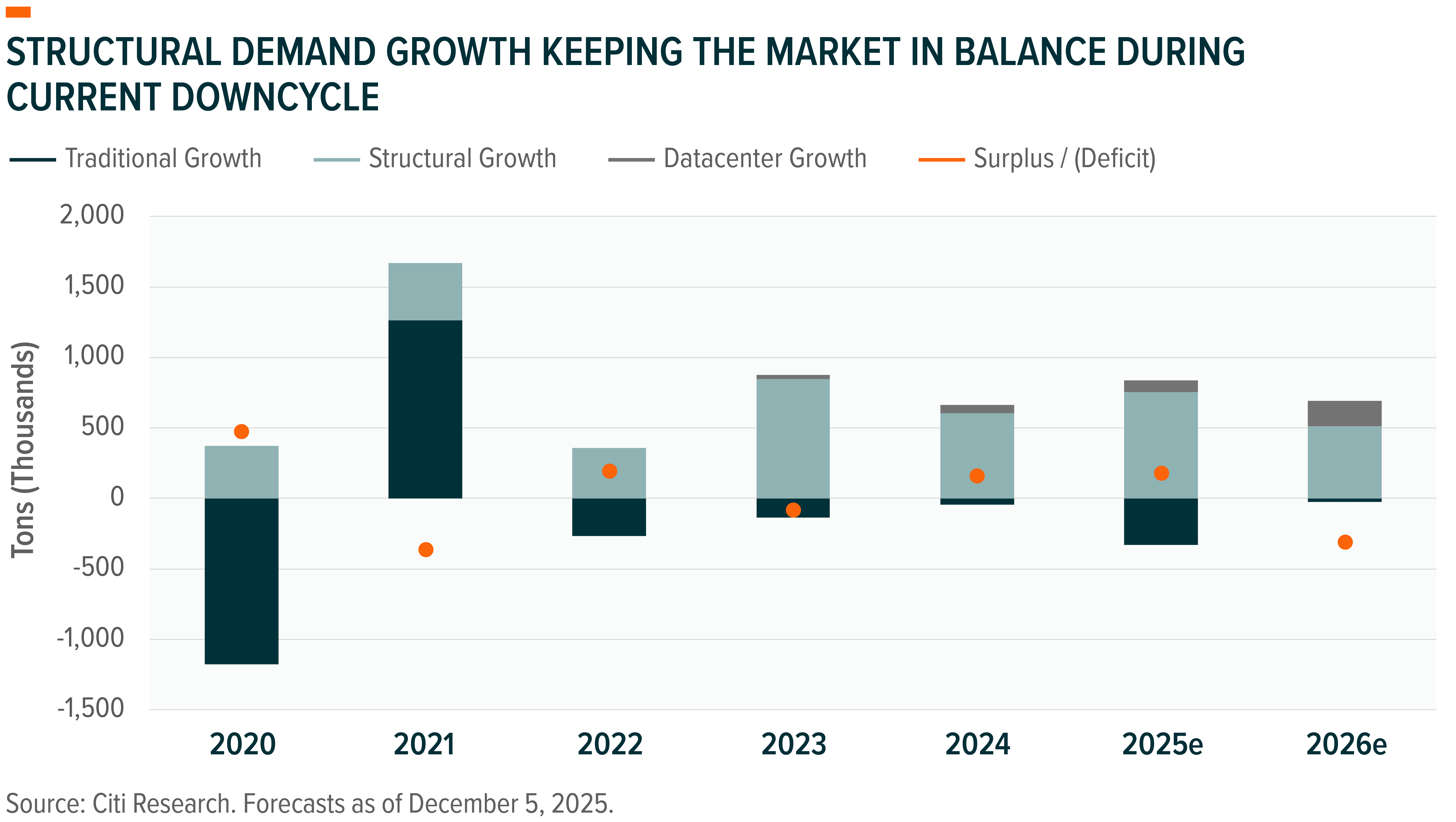 Despite copper prices rising to all-time highs in 2025, we see a strong fundamental backdrop heading into 2026, with macro tailwinds aligning with the structural copper story. We see the macro backdrop as favorable for copper and hard assets in general, with easier monetary policy from the Federal Reserve and a positive fiscal impulse helping support the demand growth outlook. A more dovish FOMC could also add to the U.S. dollar weakness seen in 2025, potentially benefitting hard assets like copper while also providing global central banks more room to ease monetary policy in order to boost domestic growth. Beyond these macro tailwinds, we expect demand for electrification to remain robust, with the artificial intelligence datacenter buildout continuing to grow very quickly as AI becomes an important force driving incremental demand. Copper mine supply growth should also remain low in 2026, with limited new projects expected to come online during the year, while Cobre Panama and Grasberg volumes remain either offline or well below previous estimates. All in all, we don’t expect to see a robust demand recovery like in 2021. Rather, we see the potential for a modest recovery pushing the copper market into deficit, which should in turn support copper prices.