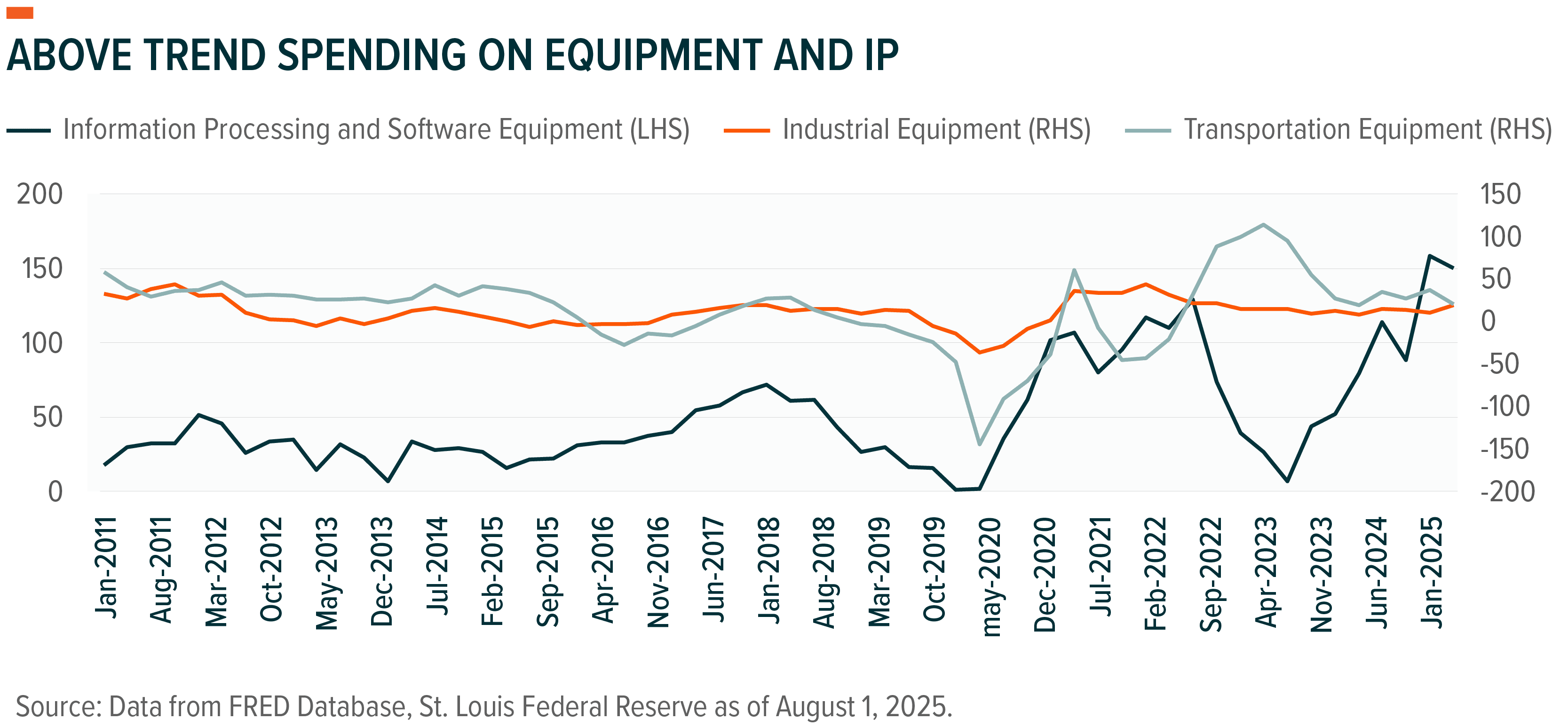 Also, while construction firms have leveraged computer-assisted tools for years, new AI use cases show promise. Energy equipment and manufacturing company GE Vernova announced plans to acquire Alteia SAS, which developed an AI system that uses photos of power lines and transmission structures to assess storm-related damage.9 With this information, companies responsible for the electric grid can react more quickly to make repairs and be more proactive in reducing risks in their most vulnerable areas. While headlines around U.S. investment were lack luster for Q2 2025, investment in both information technology (including software) and industrial equipment are growing at near record levels.10