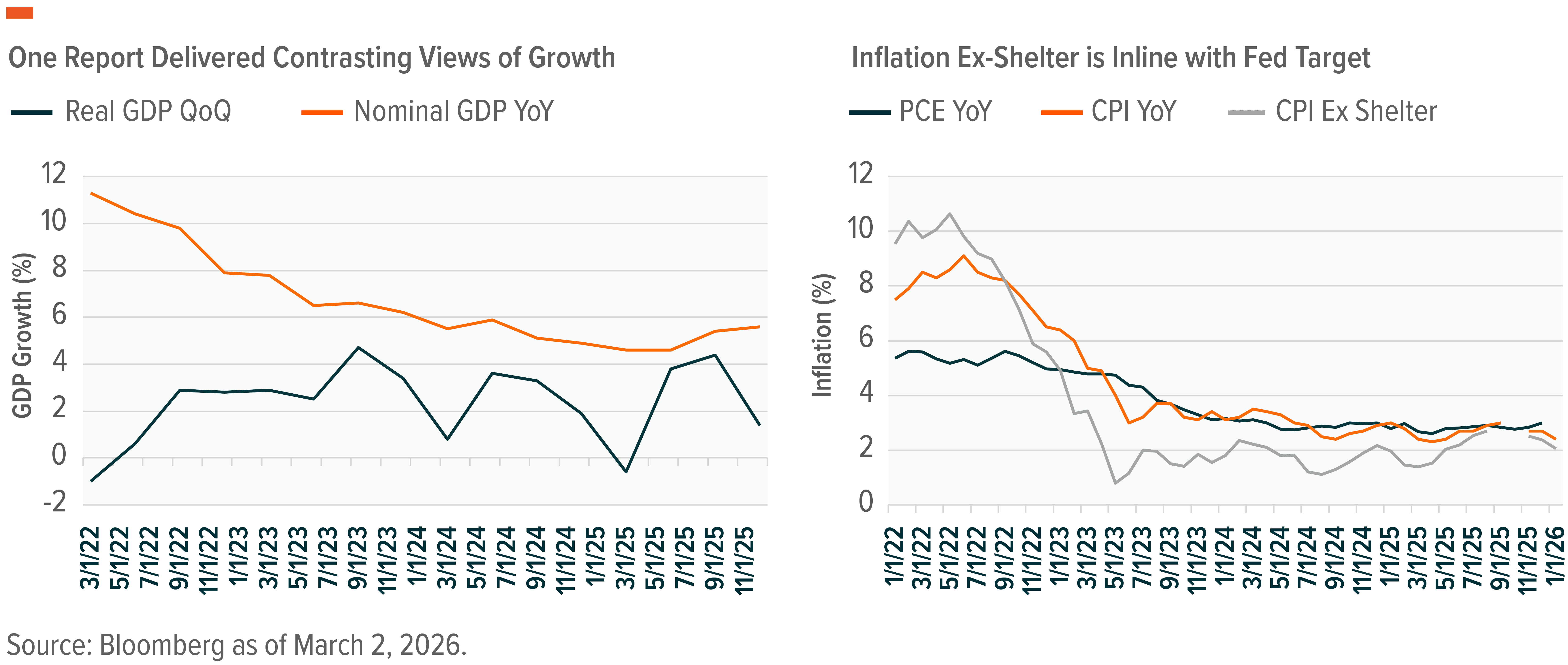 Quarter-over-quarter GDP growth was revised down from 1.4% to 0.7% for Q4 and meaningfully below consensus expectations for 2.0%.5 The miss was largely due to the falloff in government spending and exports; meanwhile, real consumption and investment were up 2.0% and 3.3%, respectively. On the inflation front, the Fed’s preferred metric, the PCE price index, came in higher than expected at 2.8% for January.6 The biggest drivers of inflation remain shelter and utility costs, which potentially hints at stagflation.