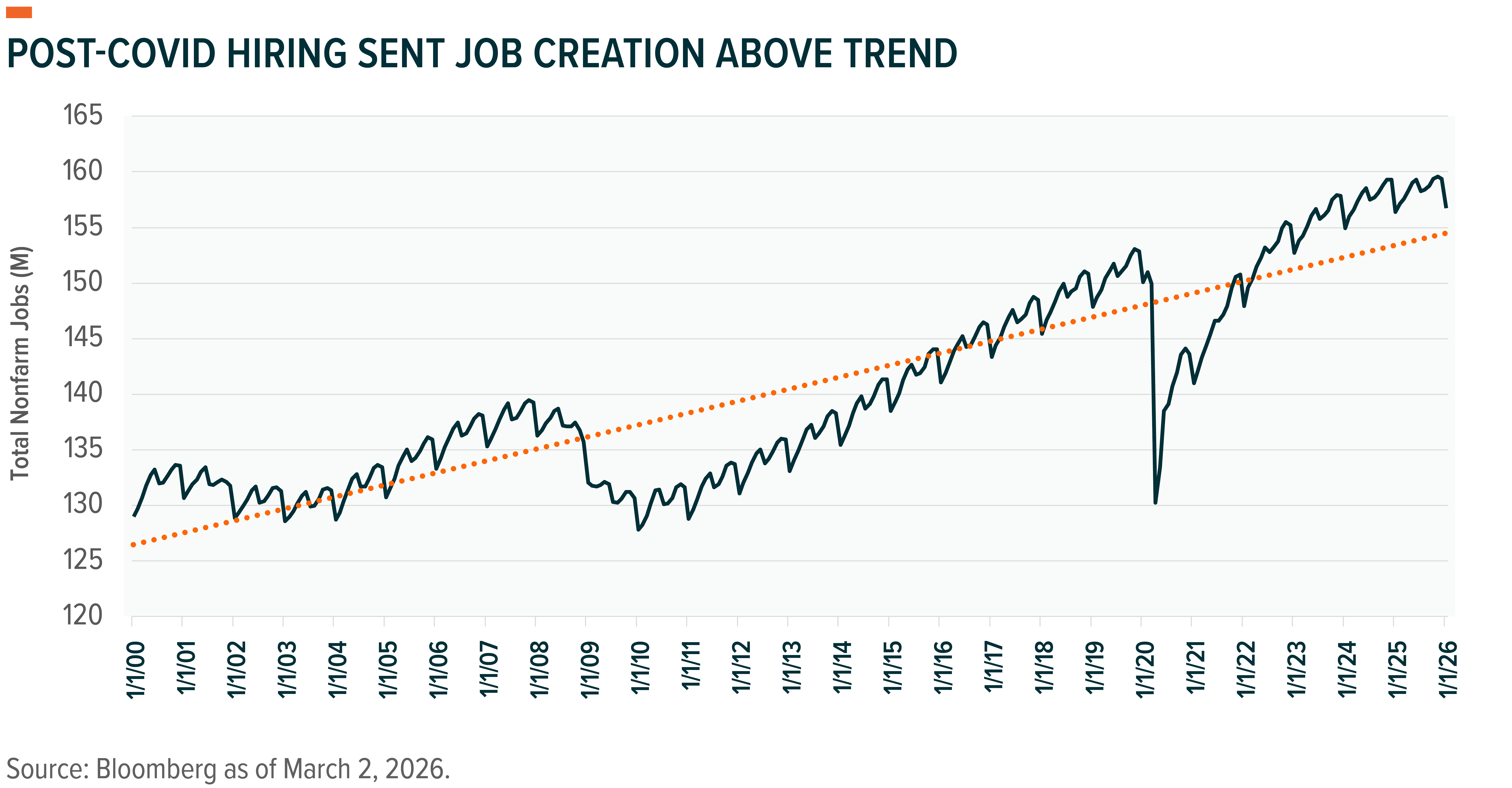 The labor market may be a swaying factor, potentially giving the Fed cover to lower rates. Job growth has been below trend for months, averaging 15,000 per month in 2025 compared to 90,000 going back to 2000.10 That trend might seem problematic, but it’s not that bad given COVID-era distortions. The economy shed jobs at the fastest rate ever during the pandemic shutdown, only to add them back at the fastest pace ever over the subsequent 18 months. The result was above-trend job creation.