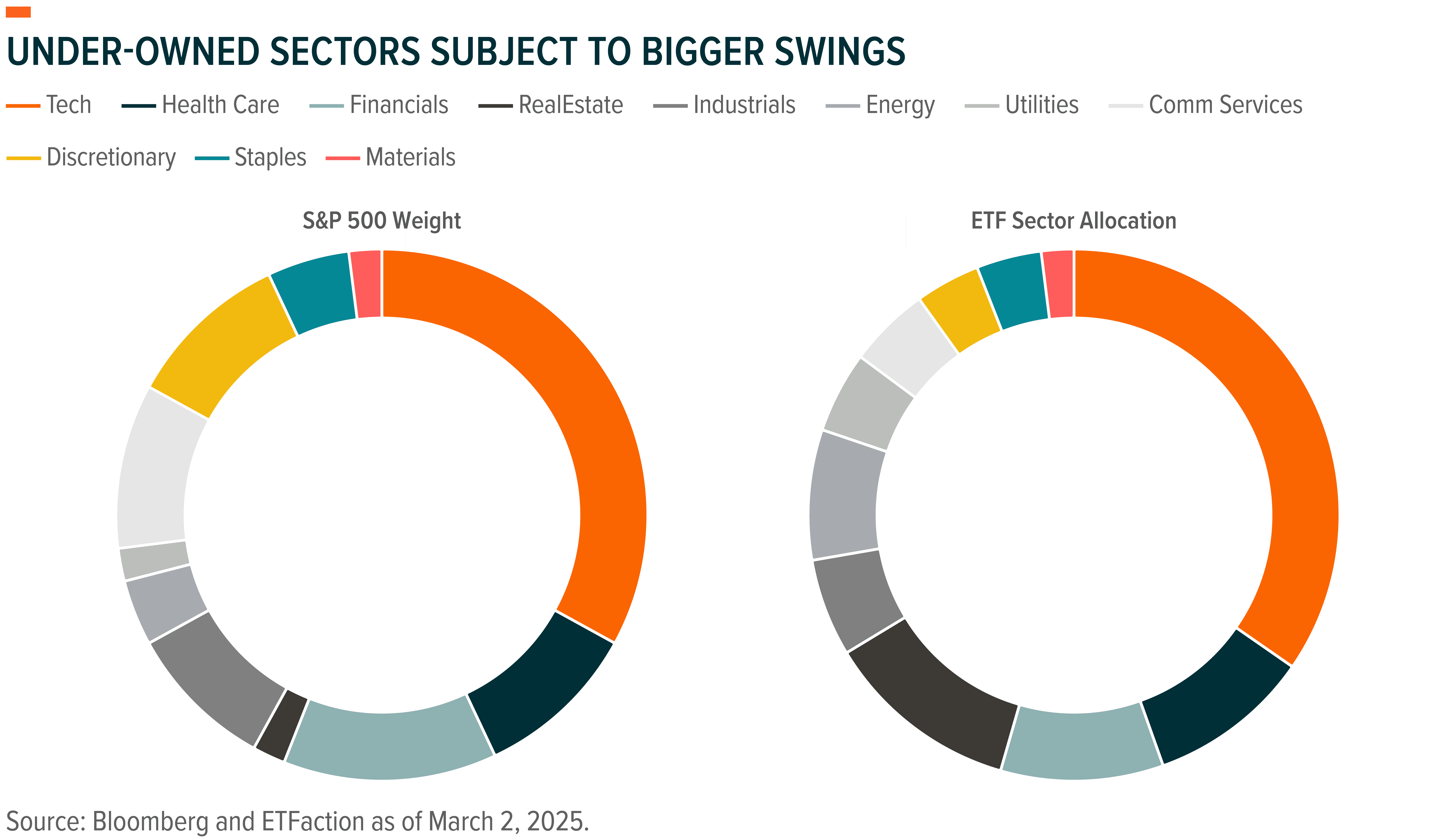 Perhaps the most significant trend in equities so far this year is the rotation driving wide dispersion between leaders and laggards despite relative calm at the index level. It does not take much to move the needle on under-owned sectors, especially those with lower index weight. Based on ETF sector ownership relative to the S&P 500 weighting, tech and healthcare remain over-owned relative to other sectors.14