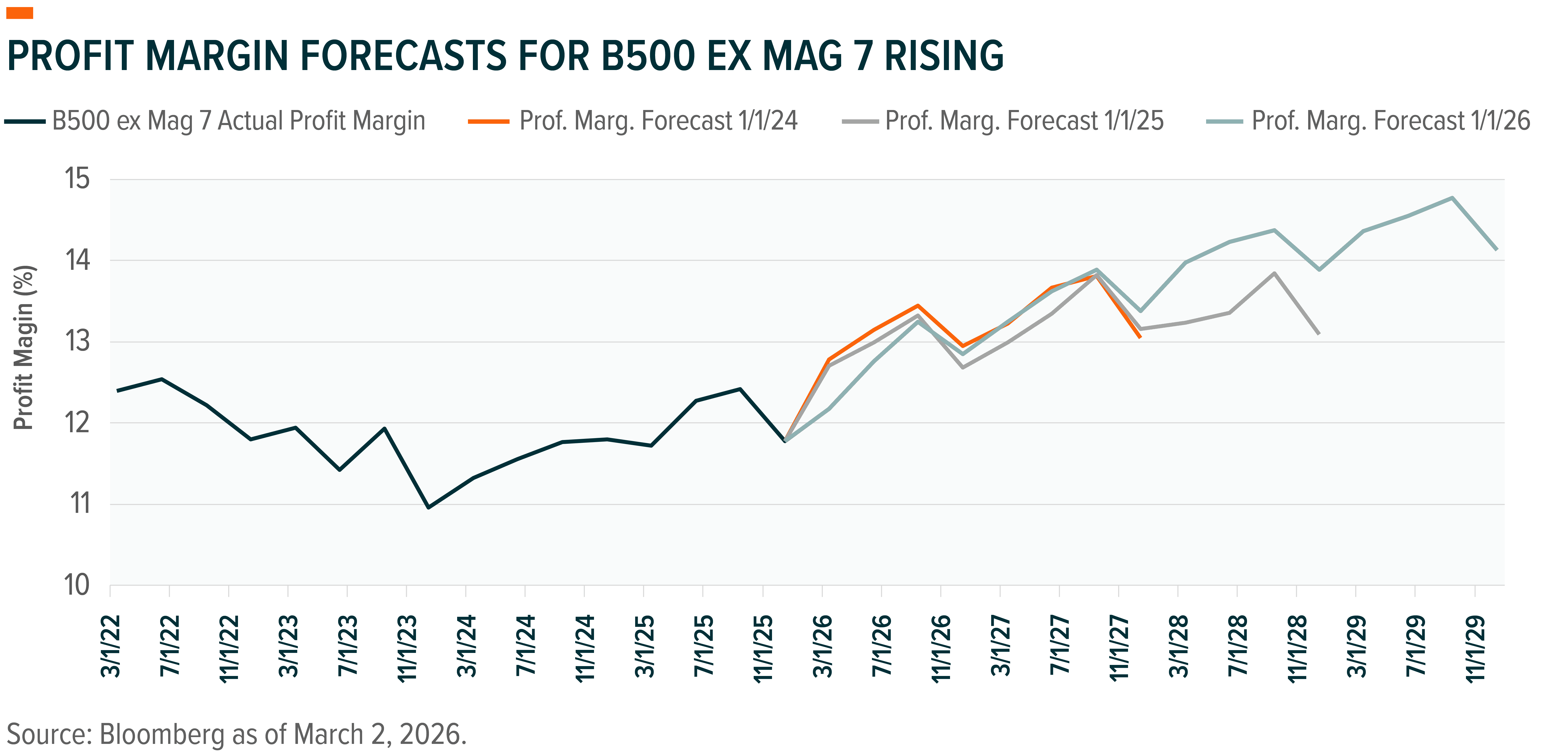 This is the economic broadening we have been talking about for the past two years. The critical caveat is that more companies will become more productive by adopting automation and AI. Selling off the very technology critical to productivity improvements in other industries ignores the co-dependency. Profit margin forecasts for the Bloomberg 500 excluding the Magnificent 7 jumped from 2025 to 2026 as more analysts started incorporating AI-driven efficiencies.17 For cyclicals to make good on those numbers, AI companies must deliver the goods.