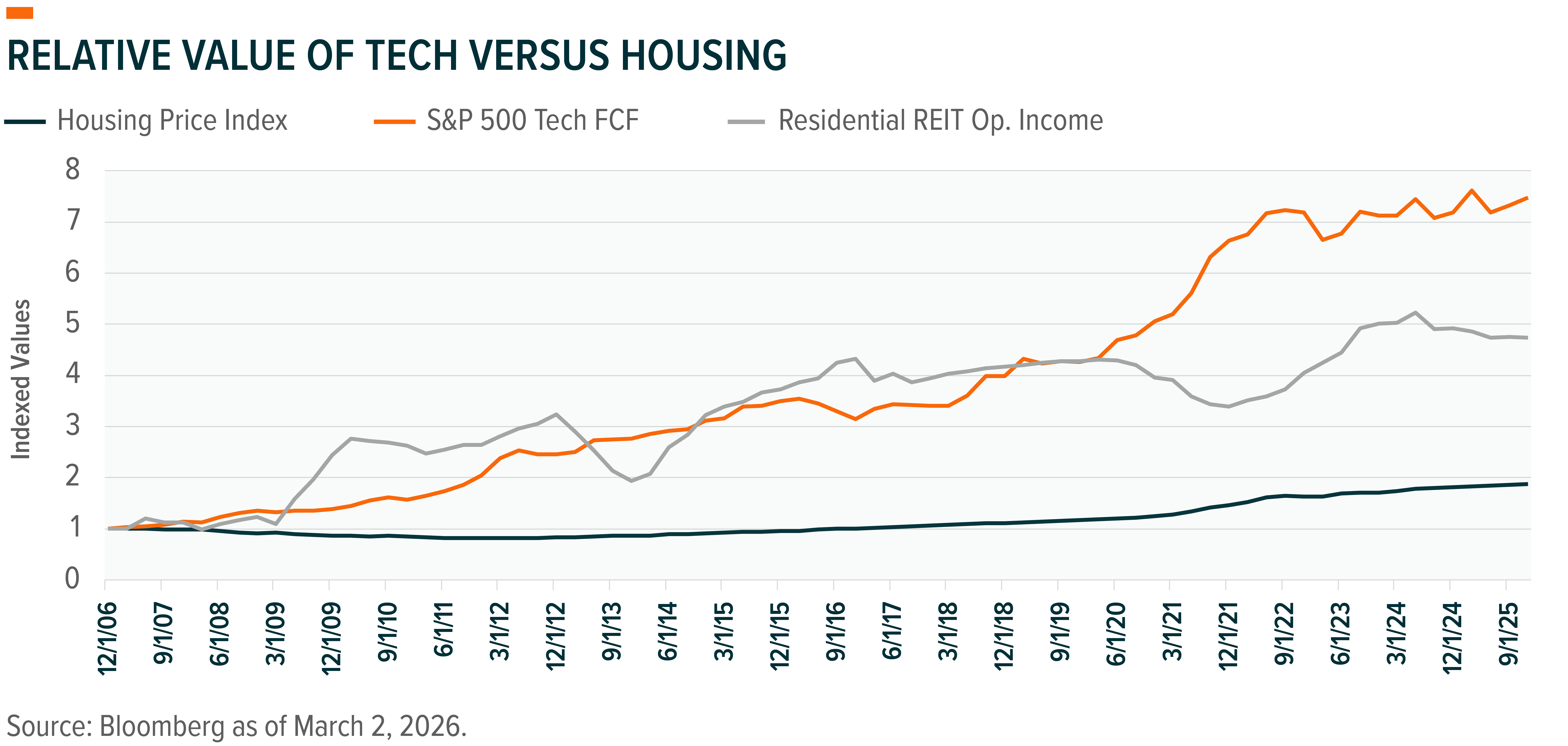 Investment in the AI ecosystem remains a primary growth engine for the U.S. and the global economy. While the software sector may have fallen out of favor and faces revision to long-term growth expectations, massive capital expenditures continue to boost interconnected sectors like infrastructure, materials, and utilities. There is, however, concern that all the spending is a house of cards, akin to the circular nature of home financing that preceded the Global Financial Crisis in 2008.18 In our view, that comparison is apples to oranges.
