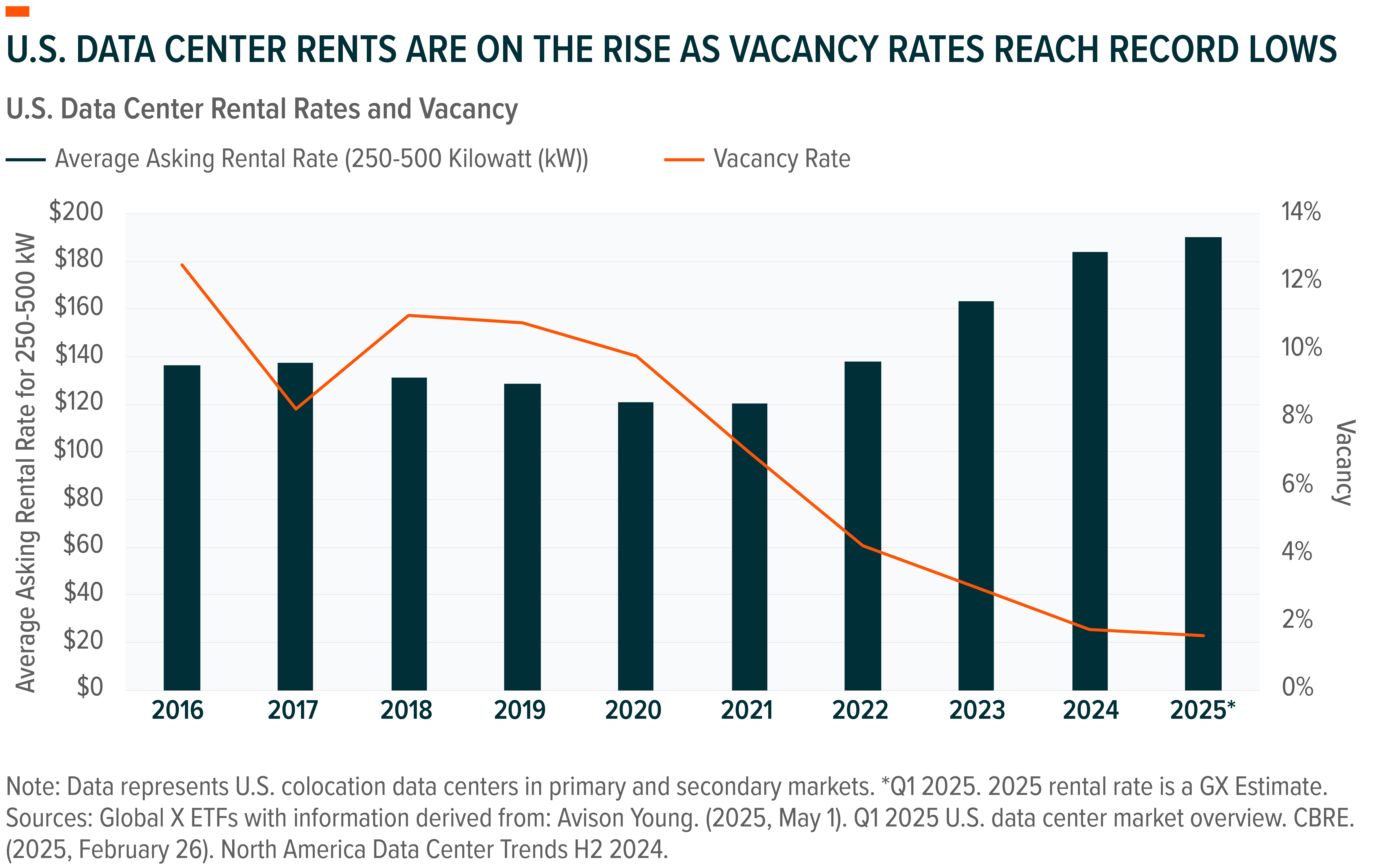 As demand for AI compute surges, U.S. data center capacity is reaching critical limits. Across major U.S. data center markets, vacancy rates are at historic lows. In Q1 2025, vacancy stood at just 1.6%, with key hubs like Northern Virginia operating even tighter.7 This trend persists even amid record breaking new construction activity in 2024, which saw nearly 7 GW of new capacity brought to market, twice that of the year prior.8 For context, new data center absorption grew 34% YoY in 2024, after a 26% growth in 2023. Given the typical 12-18-month data center development timeline, this imbalance is expected to continue well into 2026.