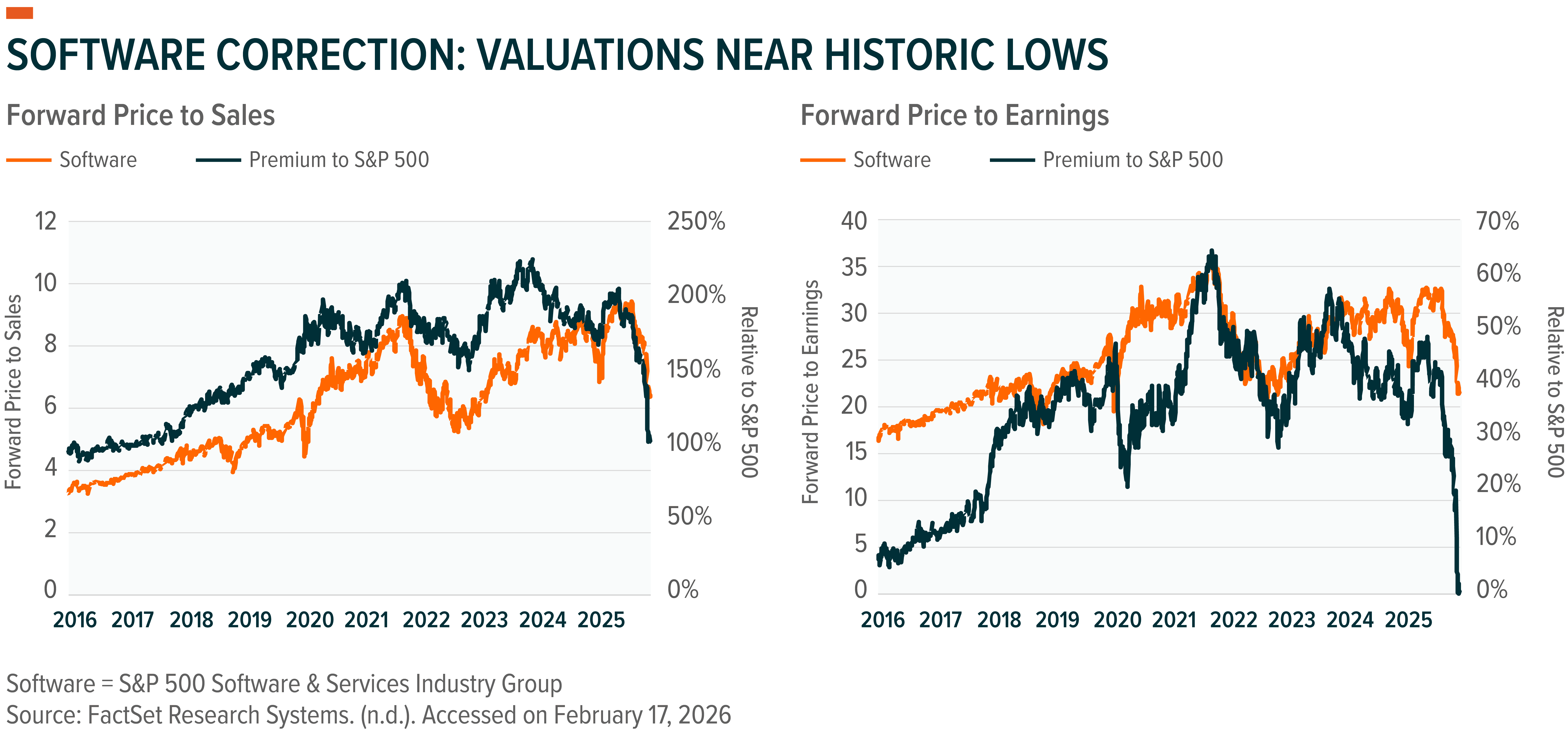 In software, enterprises may buy fewer generic seat licenses, but they will likely continue investing in the systems that connect models to data, govern agentic actions, enforce security. The post-selloff setup looks more like a sorting event than a sector unwind.