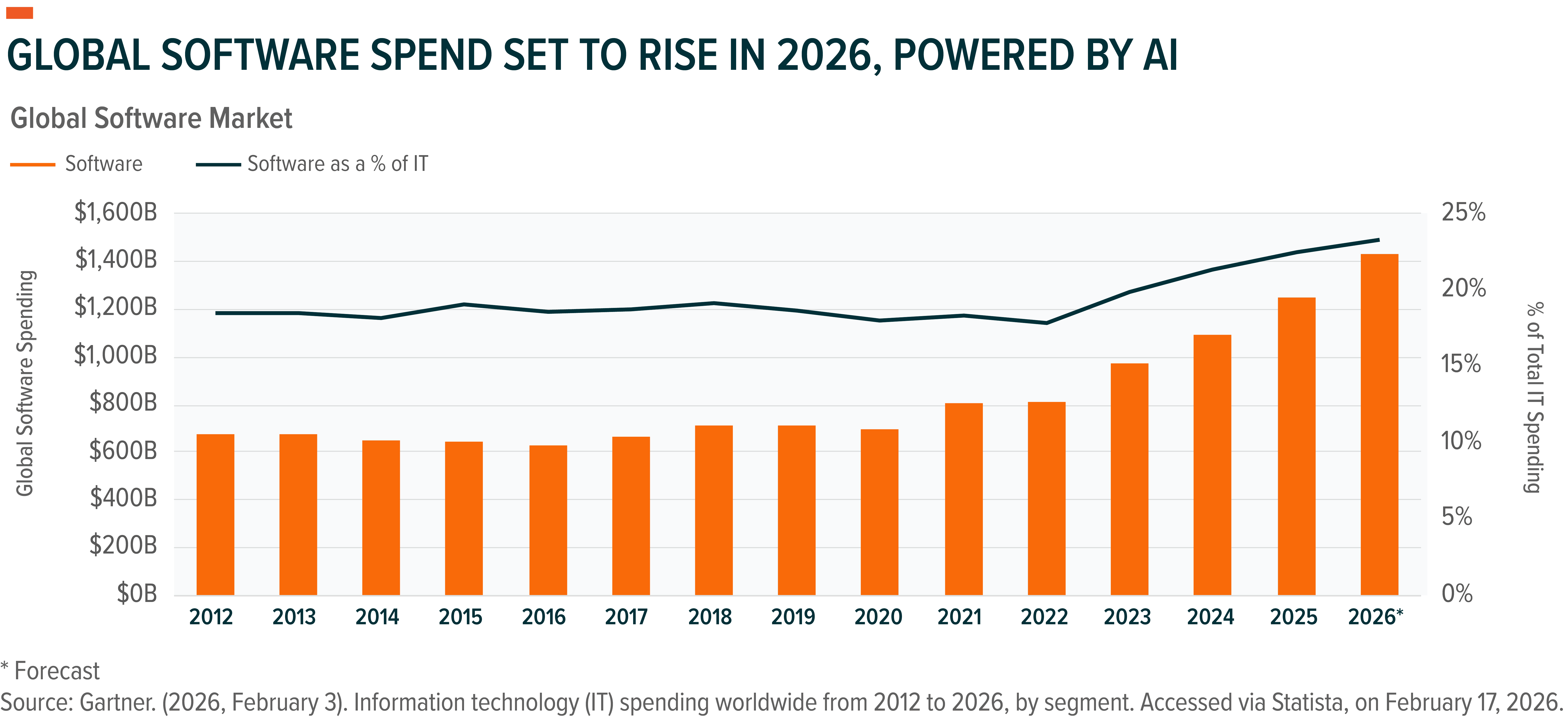 Stepping back from the recent volatility, enterprise budget line items tell a different story. Worldwide, IT spending is expected to reach $6 trillion, with software accounting for nearly $1.43 trillion – up 14.7% YoY (year-over-year). That puts software at roughly a bit over 23% of total IT spend, and still one of the fastest-growing major categories.6 Even more telling, GenAI model spending still implies ~80.8% growth in 2026, which means AI-related software is rapidly expanding even as the market debates disruption risk.7