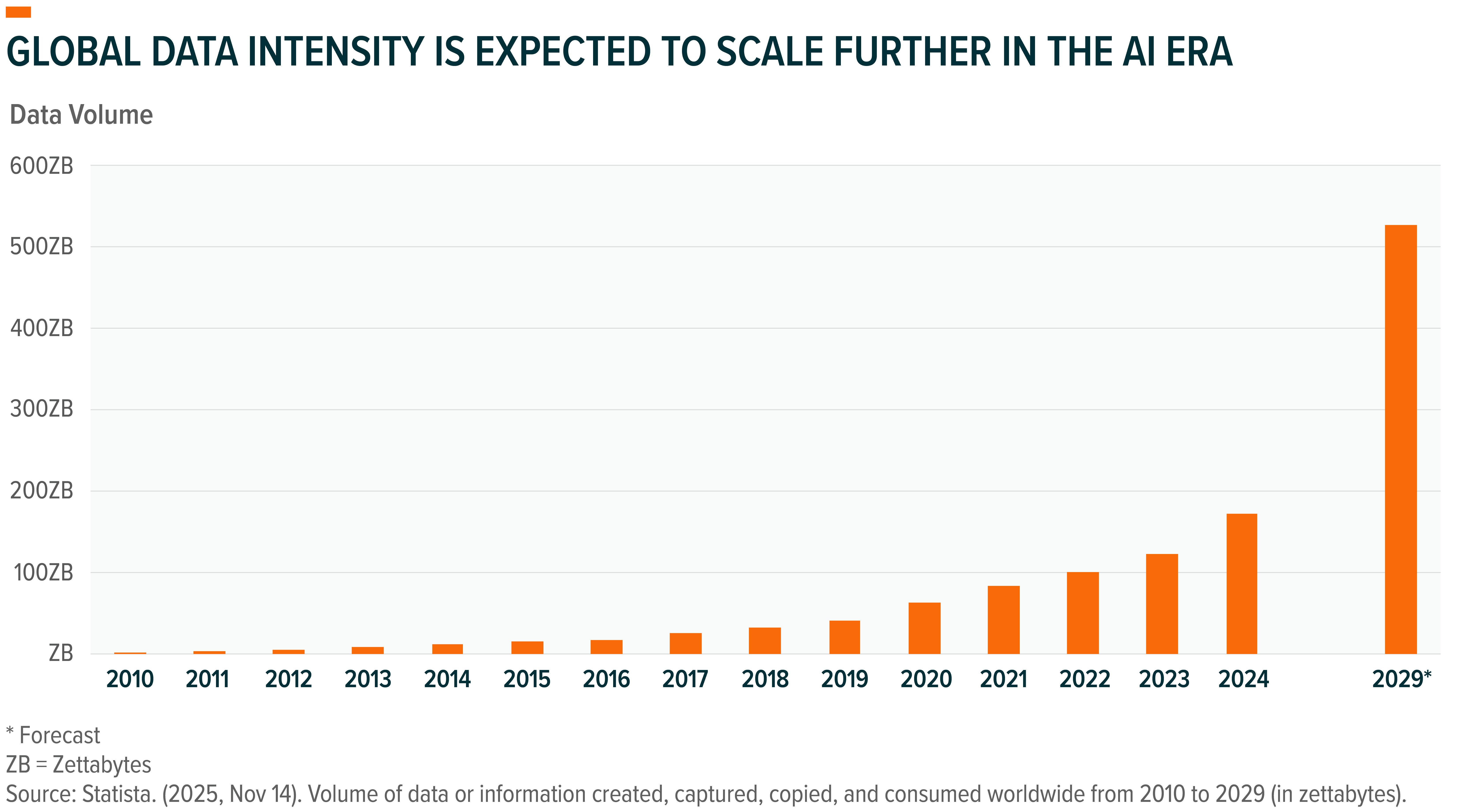 Third, software’s job has always been to translate rising data intensity into something operational: systems that store, secure, move, and interpret information. That underlying driver is not slowing. Global data created, consumed, and stored is expected to rise 254% – from ~149 zettabytes in 2024 to ~527 zettabytes by 2029.9 That surge reflects the sheer data intensity of AI. If that trajectory is directionally right, software spend is unlikely to compress while that happens.