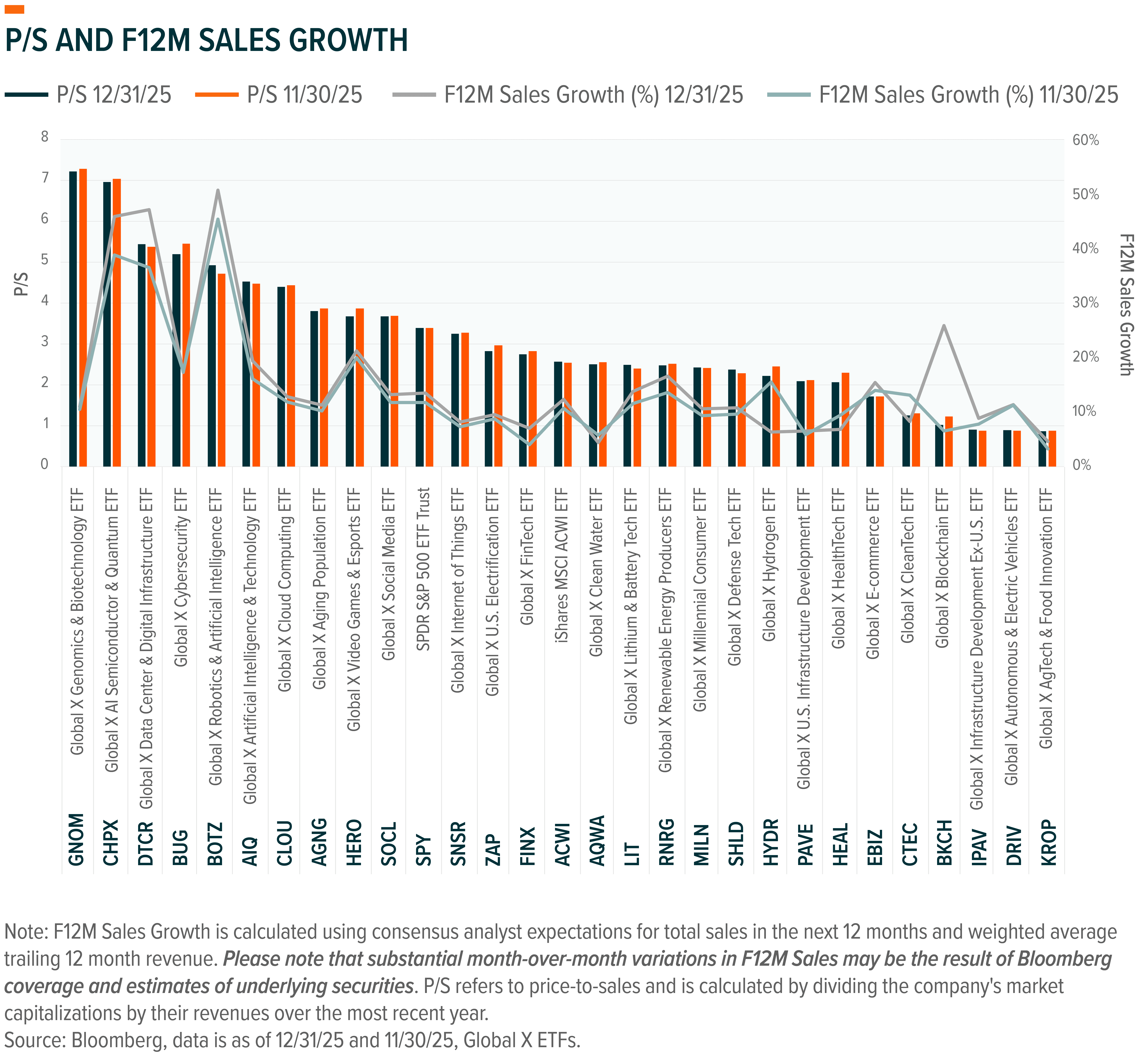 The following charts examine returns and sales growth expectations by theme, based on their corresponding ETFs.
