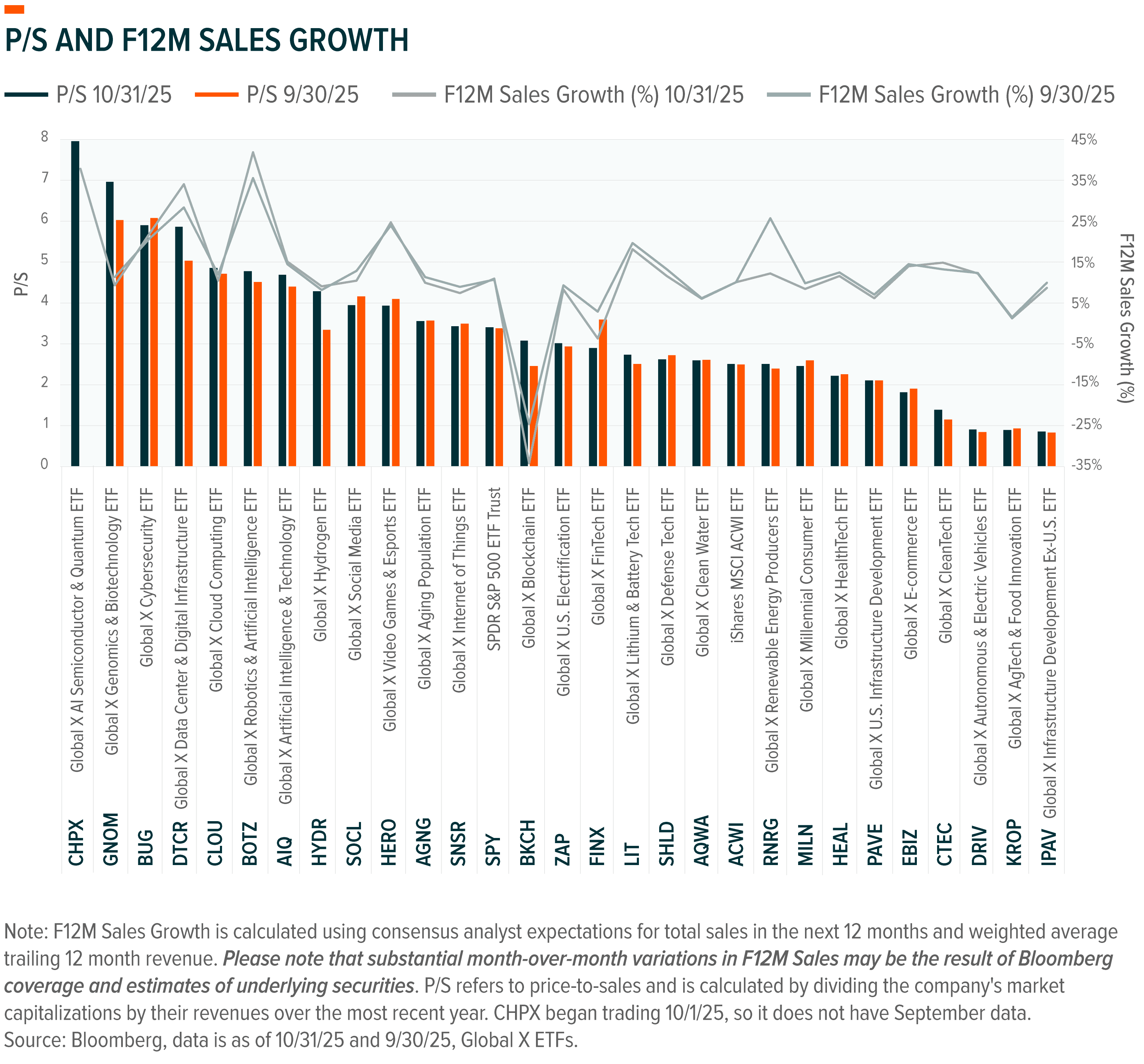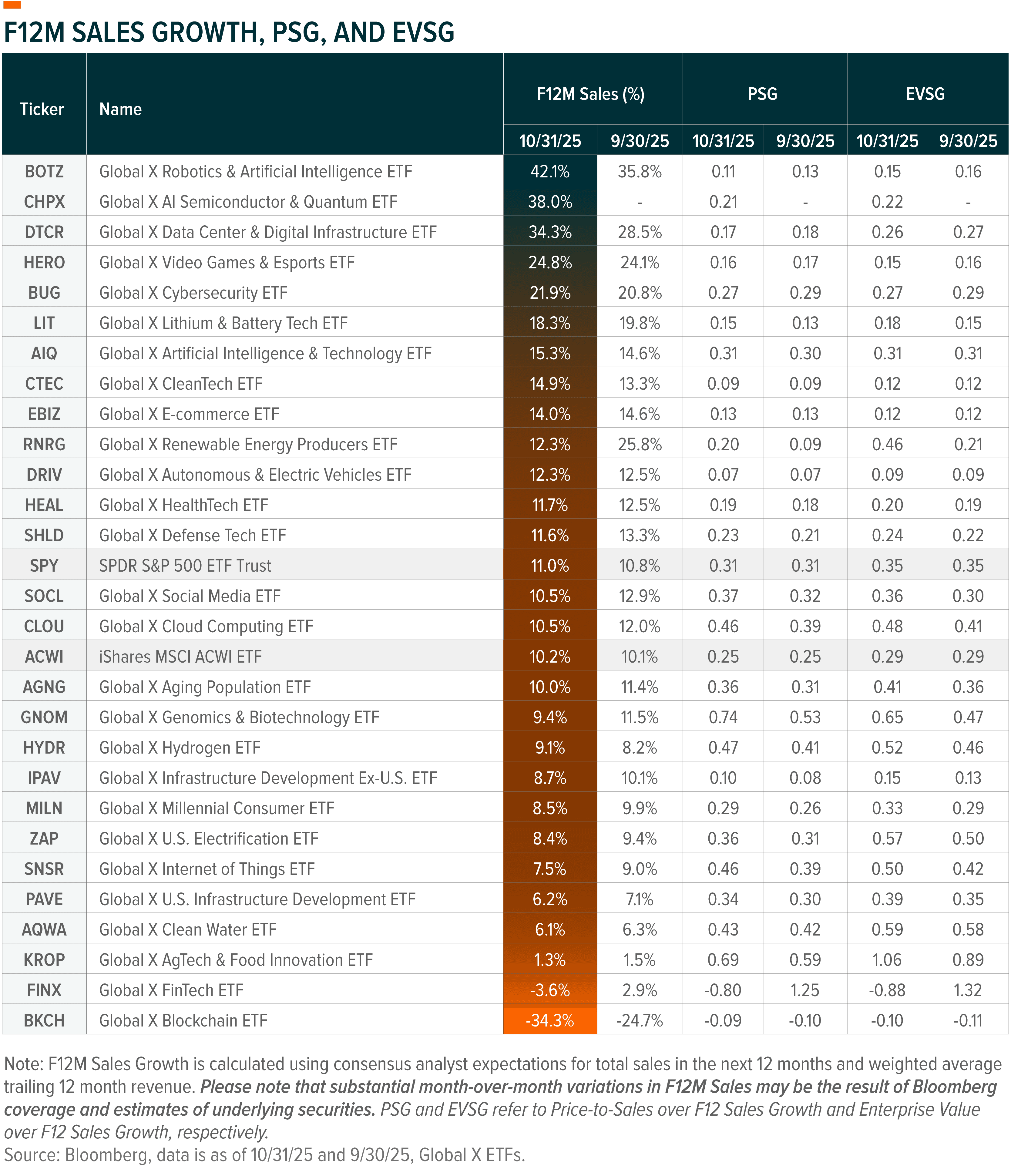 The following charts examine returns and sales growth expectations by theme, based on their corresponding ETFs.