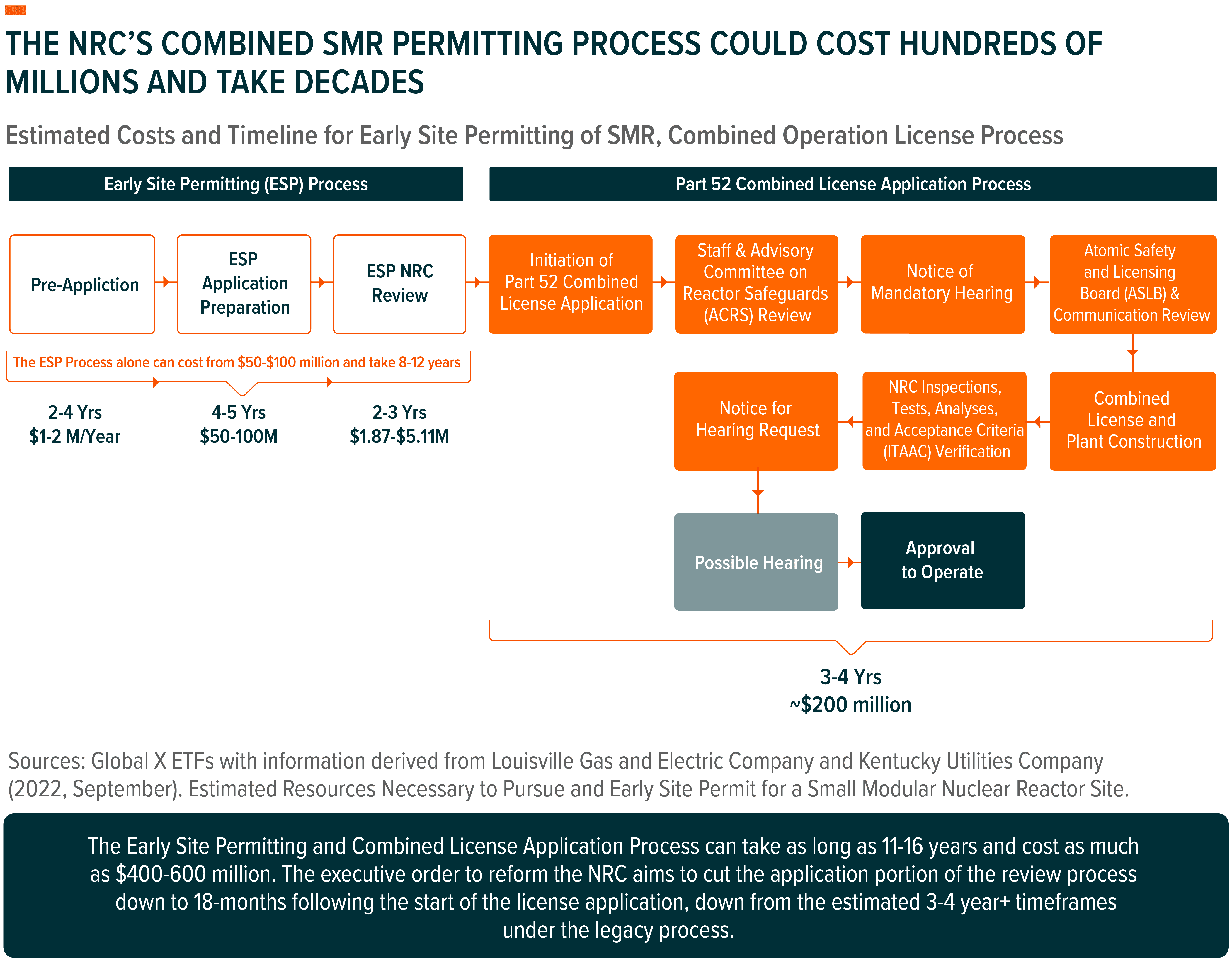 We believe the most consequential aspects of the first order, which directs the reform of the NRC, were the explicit limitation in licensing costs and mandated reduction in approval timelines9. This includes the setting of 1) an 18-month deadline for rendering a final decision on applications to construct and operate a new reactor, 2) a 12-month deadline for rendering a final decision on applications to continue operating an existing reactor, as well as 3) fixed caps on the NRC’s recovery of hourly fees. In theory, this order could shave years off review timelines, potentially saving the nuclear industry hundreds of millions of dollars in regulatory costs and substantially shifting the economics for new nuclear builds and restarts.
