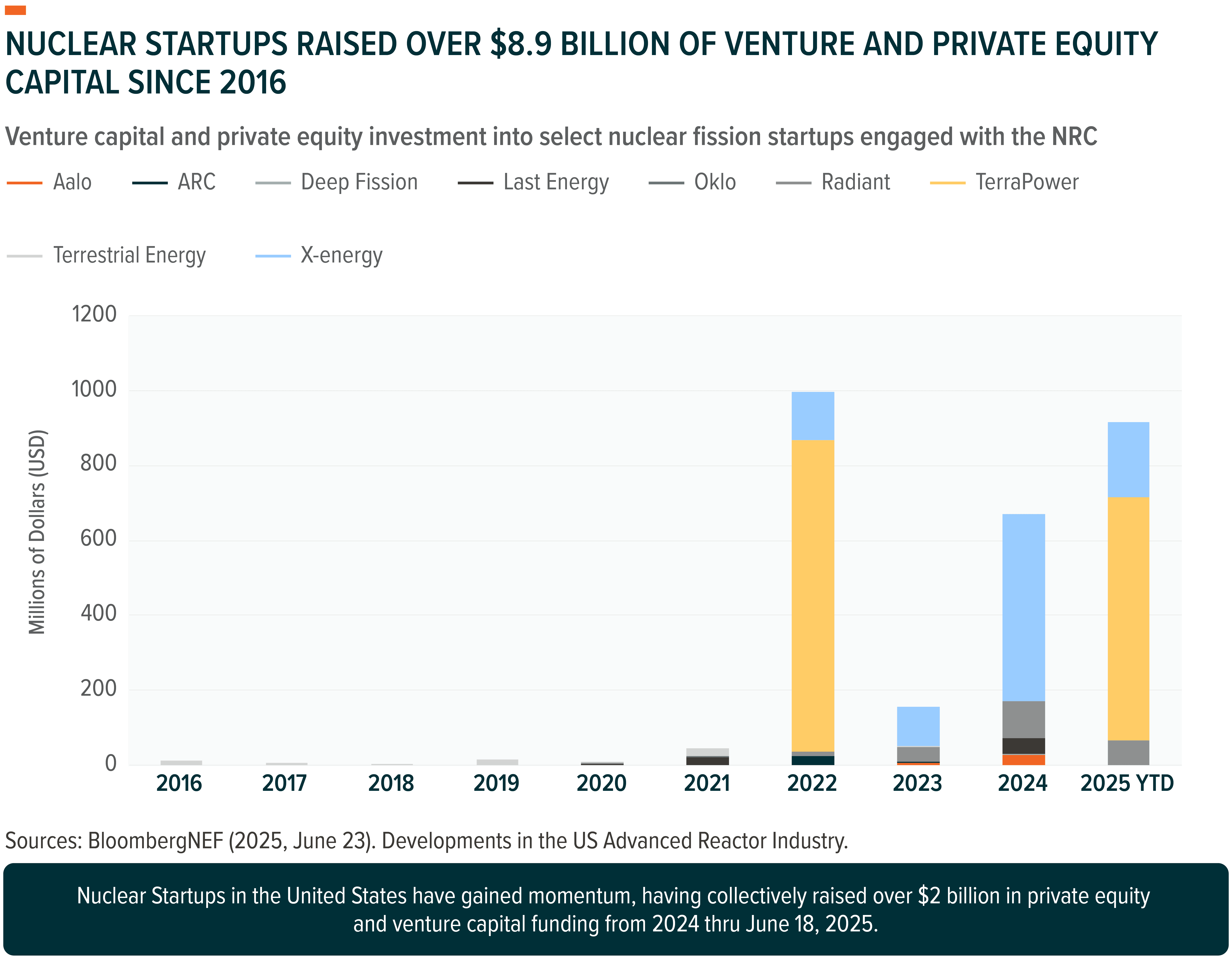 In addition to the efficiency mandates cited above, this order establishes a goal of achieving criticality (a continuous self-sustaining fissioning reaction) across three new reactor builds by Independence Day 2026. It’s already represented a potential contributor to fast-tracking R&D efforts within the United States, with the DOE announcing its selection of 11 advanced reactor projects for the Nuclear Reactor Pilot Program on August 13th. Combined with the over $8.9 billion in venture and private equity capital raised since 2016, this order potentially reflects strong momentum among advanced nuclear reactor developers within the United States11.