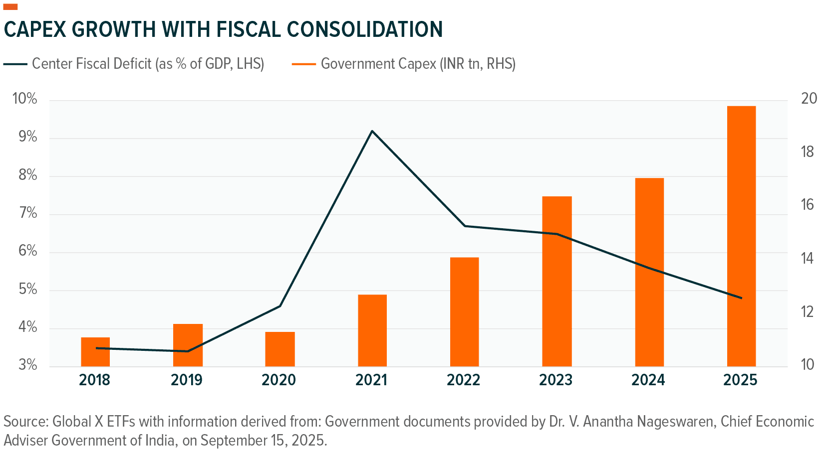- Government Emphasis on Capex Remains:Public sector capex has increased roughly 2x between FY18-26.2 Dr. V. Anantha Nageswaran, the Chief Economic Adviser to the Government of India, told us that, “Continued emphasis on government capital expenditure to boost infrastructure” was listed as the top policy priority for the government. Importantly, India achieved fiscal consolidation (i.e., reduction in fiscal deficits) of more than 5% over the past five years, declining from a peak of -9.2% to reach a fiscal deficit of ~4% of GDP, despite the significant growth in government capex.