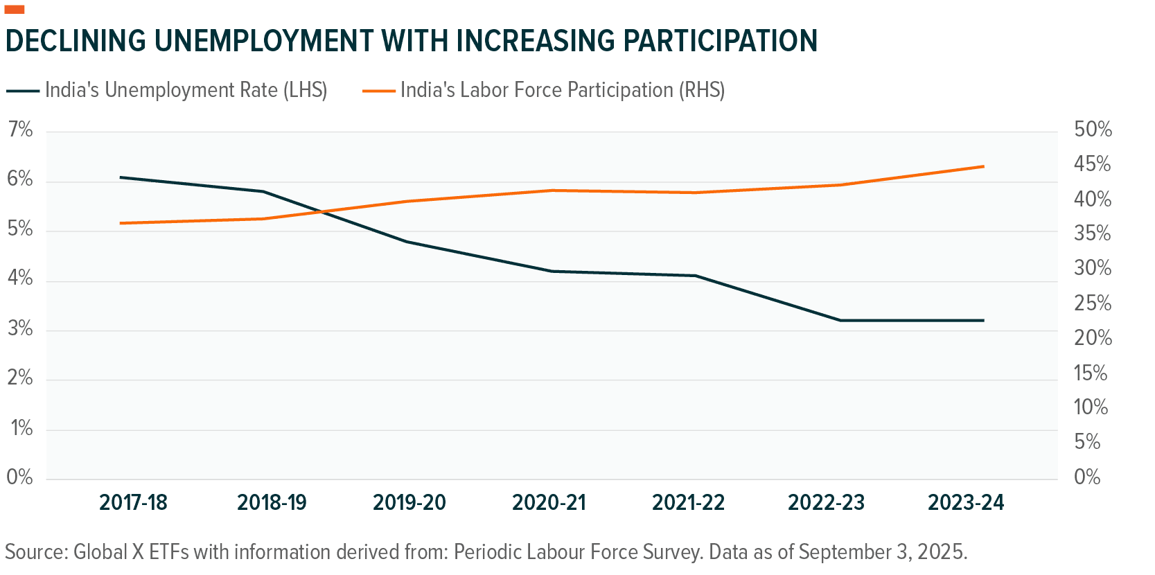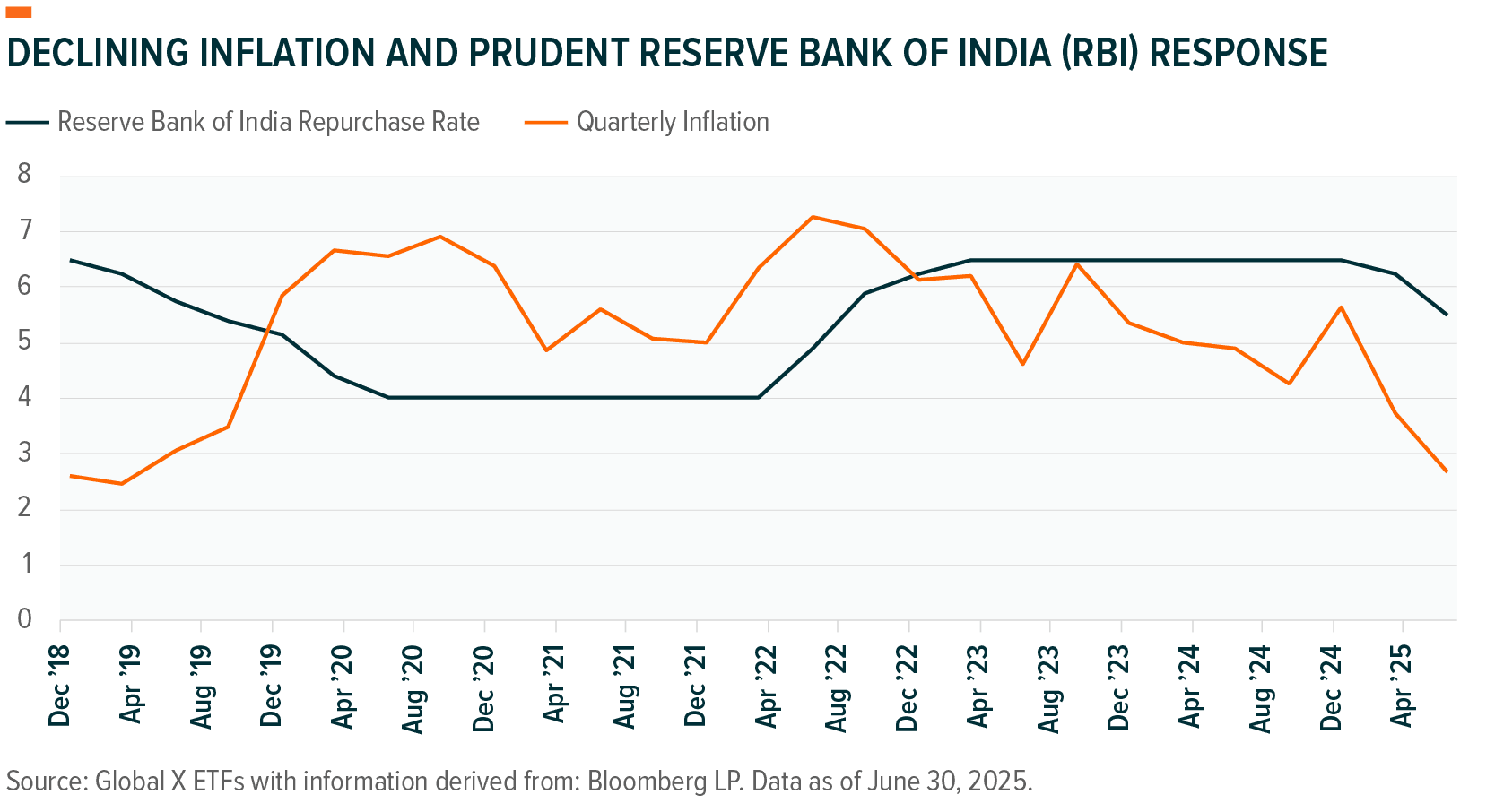 - Supportive Macro Trends:Consensus forecasts call for India’s current account deficit to be around 0.8% of GDP in FY2026, while FX reserves of USD695bn are near all-time highs and provide adequate import cover of ~11 months.3 Meanwhile, inflation is forecast to fall to ~2.8% in FY26, which has allowed the RBI to cut rates 100 basis points (bps), to 5.5%, over the first half of calendar 2025.4 In fact, July’s recent inflation print of 1.6% year over year was below that of even the U.S. and EU!5 Inflation benefited from the deflationary tailwinds of low energy prices (India imports nearly 90% of its oil requirements) and positive consecutive monsoon seasons (improved crop yields and limited food inflation).6 These drivers helped support rural livelihoods (~60% of the population), while increased reservoirs for hydroelectric power plants also tempered inflation expectations.7