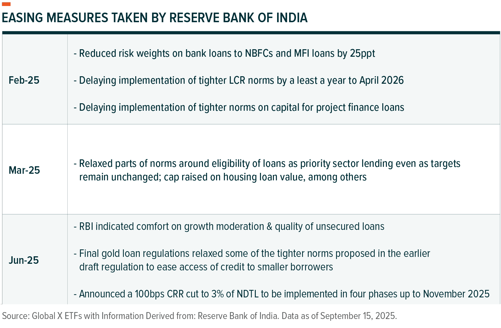 - RBI’s Shift to a Pro-Growth Stance:The RBI has shifted to a more pro-growth stance since Sanjay Malhotra took office as RBI Governor in December 2024. The table above shows several of the easing measures taken by the RBI this year.