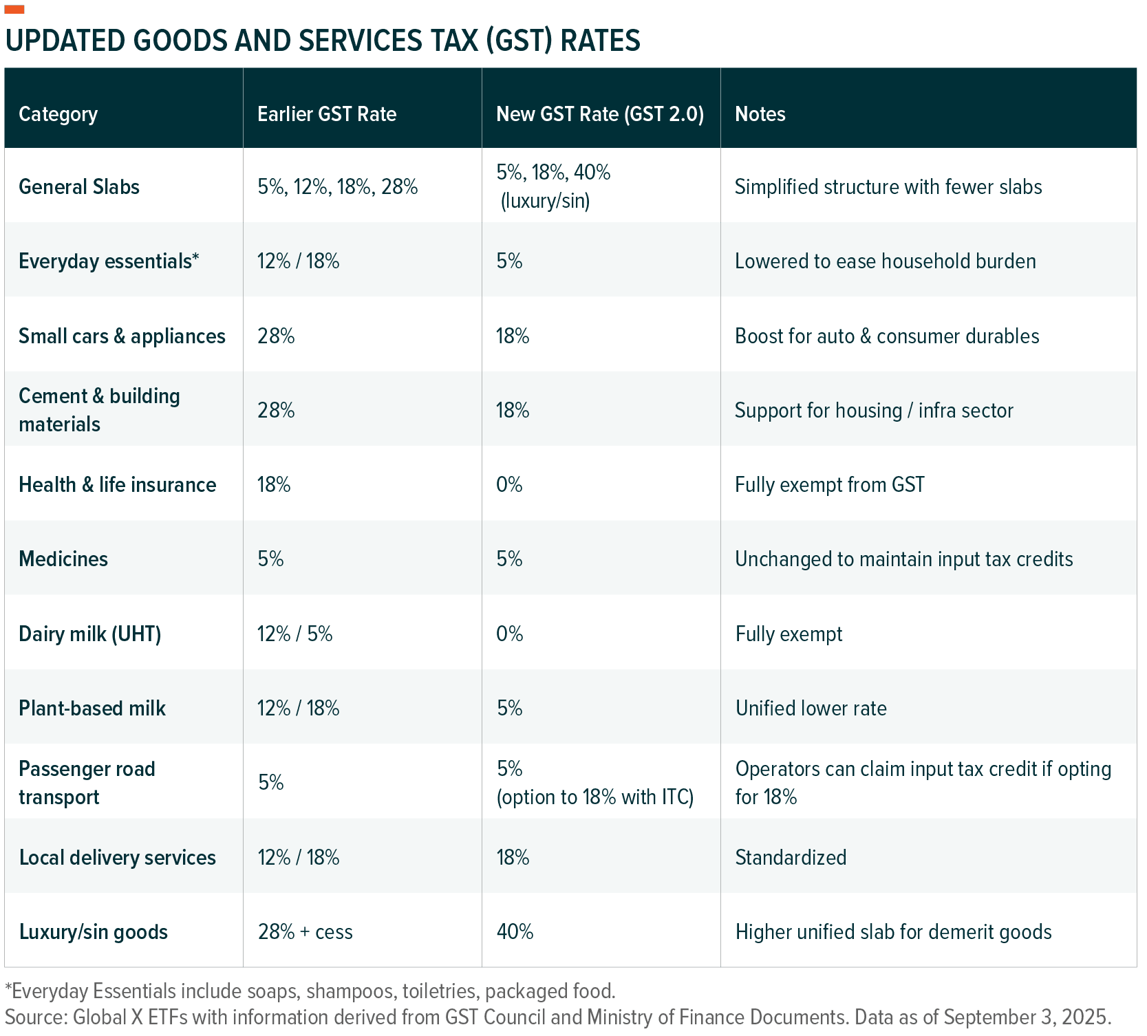 In nearly every meeting, the key theme that stood out was the clear shift in policies to support consumers. After several years of limited or targeted support, the government is finally stepping up to bolster domestic consumption. While India’s Chief Economic Adviser foresees a growth drag of around 0.5% per annum to GDP from trade and tariff headwinds, consumption focused policy changes could more than offset the trade impact, while also supporting a premiumization trend for corporates.8