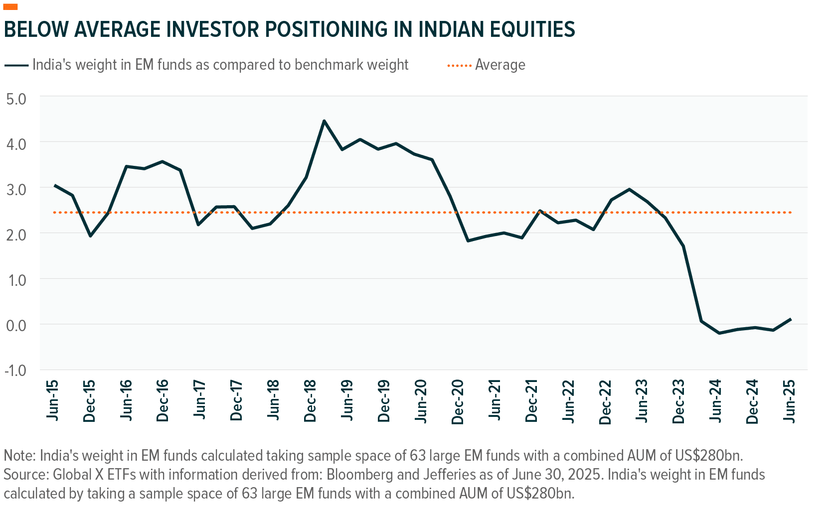 - Light Foreign Portfolio Investment (FPI) Positioning:Over the past year, India’s weight in EM Funds compared to the benchmark weight has declined from an average overweight of ~2.5% to a neutral position, setting up a potential catch-up opportunity.