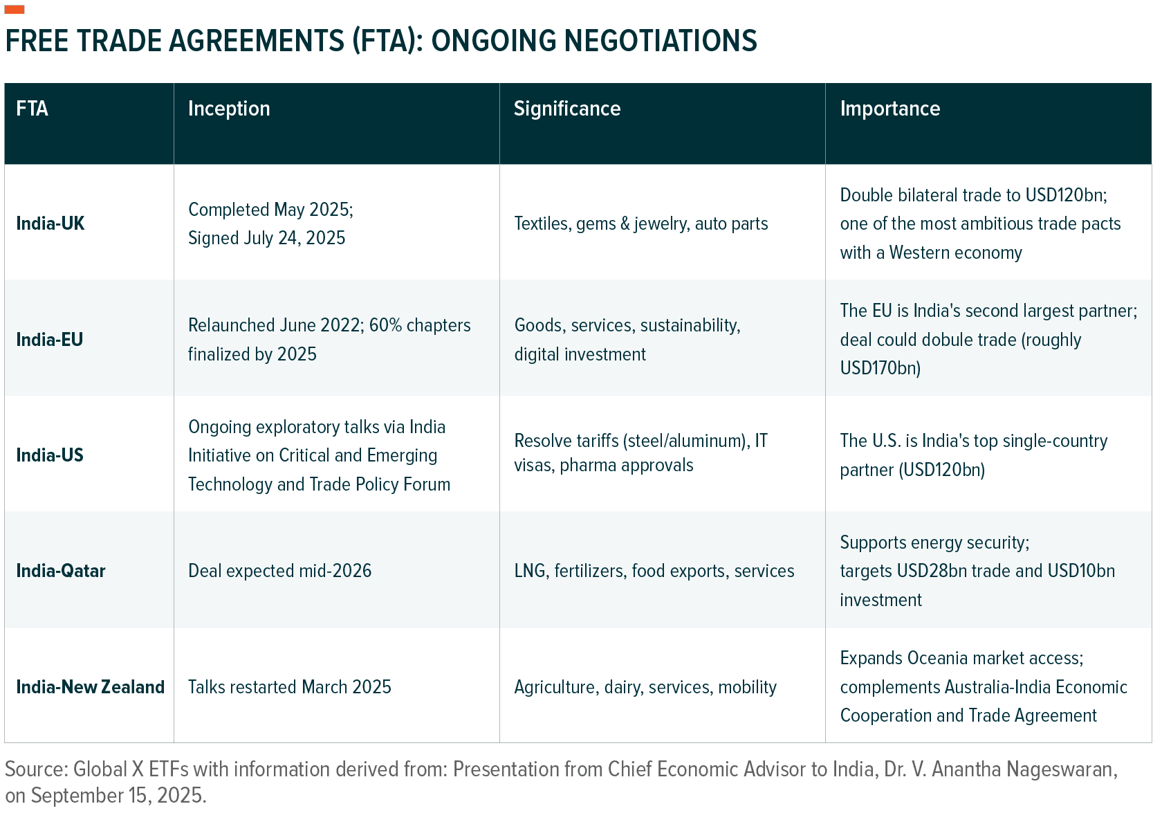 - Diversifying Trade:Though we expect symbiotic deals with the U.S. and Europe, the government has a clear mandate to diversify exports by fast tracking trade agreements in Asia, Africa, and Latin America. We also note the recent agreement India signed with the UK.