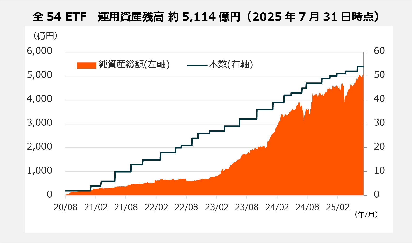当社では、2020年8月に初めてグローバルX MSCI スーパーディビィデンド-日本株式 ETF(銘柄コード:2564)、グローバルX ロジスティクス・J-REIT ETF(銘柄コード:2565)を上場したのを皮切りに、毎年10本前後のETFを東証に上場させています。その結果、東京証券取引所へのETFの新規上場本数は、2020年度から5年度連続で当社が1位となりました。2025年7月末現在、成長テーマ型、インカム型、コア型、コモディティ型といった特色ある幅広いラインアップで54本のETFを上場しています。
