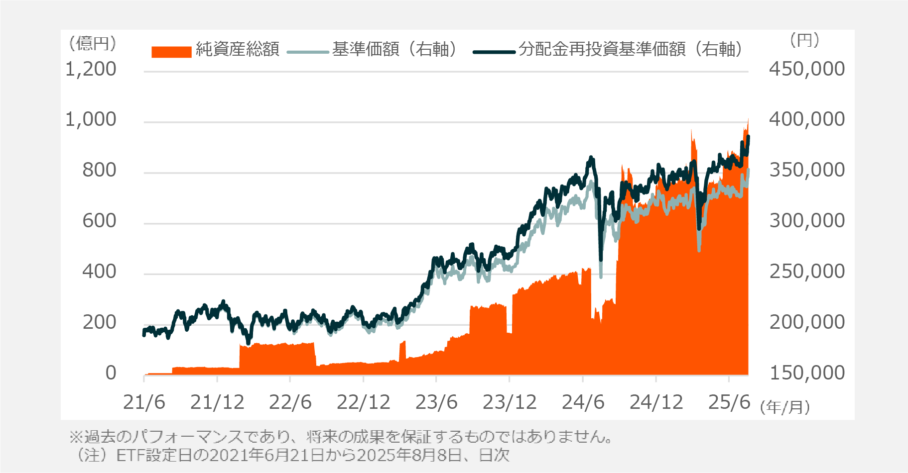 また設定来のトータルリターンも98.7%(2025年8月8日時点)と、高いパフォーマンスを発揮しており、当社を代表するETFの1つに成長いたしました。