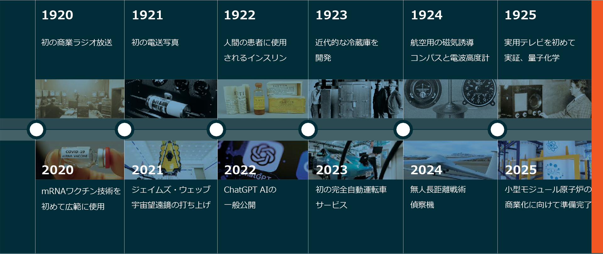 100年前、破壊的技術が日常生活のほぼ全てに影響を及ぼしました。米国の自動車は1919年の700万台から1929年には2,700万台に急増し1、初の商業ラジオ放送と映画によってメディアとエンターテインメントが変容しました2。冷蔵庫や洗濯機などの電化製品が家事を簡素化し3,4、ペニシリンやインスリンなどの医学的ブレークスルーによって現代医療が大きく変わりました5,6。