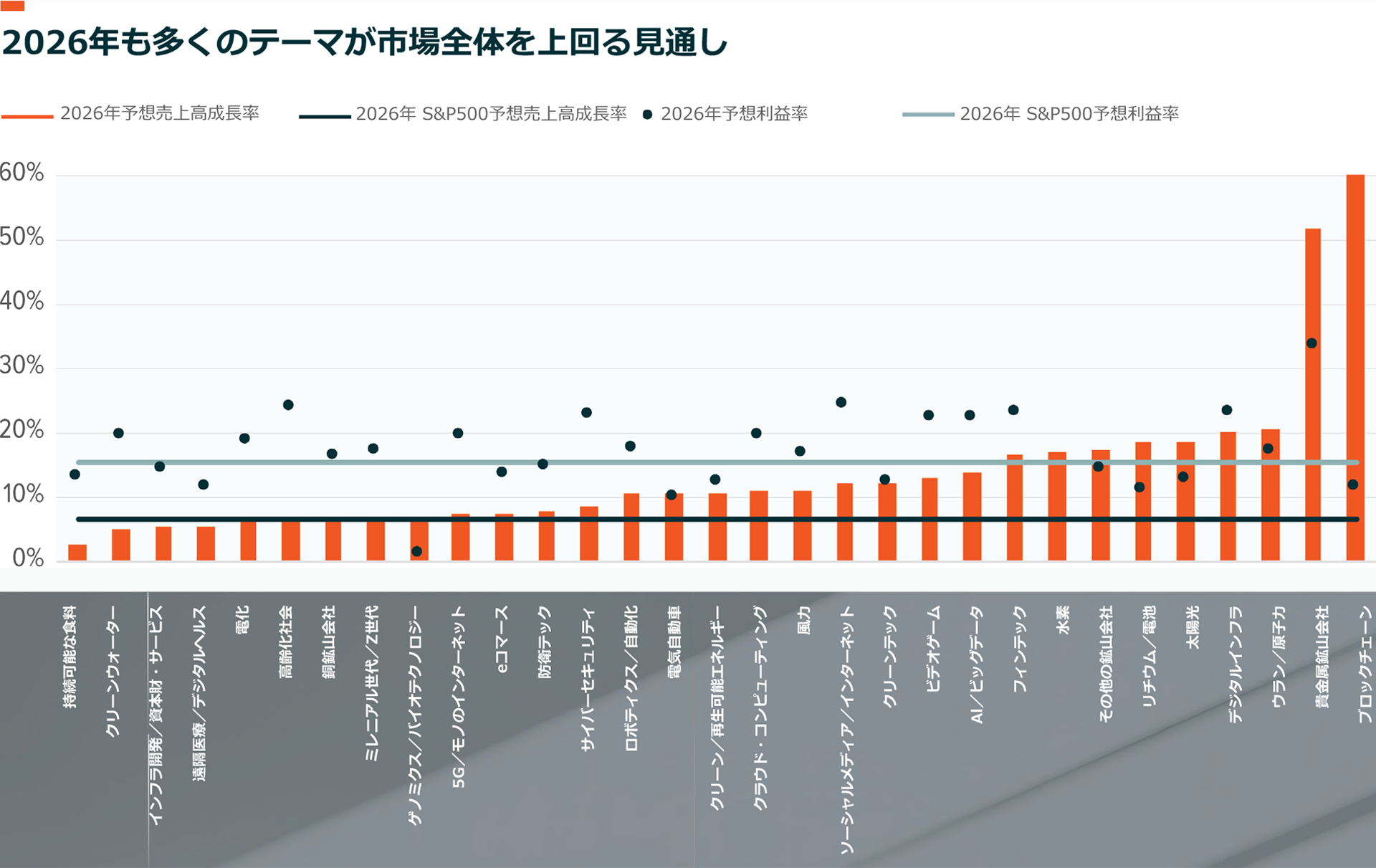 デジタルインフラや一部の再生可能エネルギー市場など、より絞り込んだいくつかの分野では、高い売上成長率と健全な収益性が見込まれます。例えば、データセンターを支援するAI関連のハードウェア、ソフトウェア企業、あるいはウラン・原子力プロバイダーの2026年の売上高成長率はS&P500企業の2倍以上にあたる14~21%に達すると予想されます36。AIとデータセンターの分野はこの間に16%の利益率を達成する見込みです。防衛テック、サイバーセキュリティ、ロボット工学分野でグローバル競争の激化に直面する企業の売上高は8~10%増加すると予想されています37。インフラ開発、電化、銅鉱山の分野も追い風を受ける可能性が高いと考えられます。