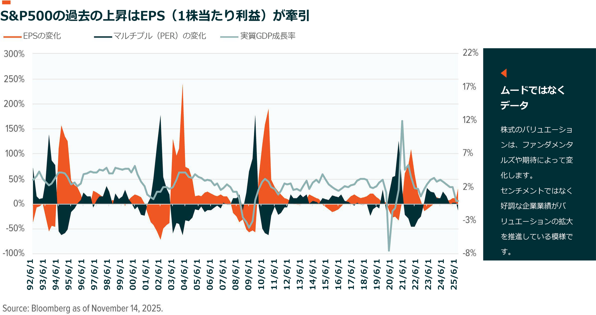 経済成長の小幅な減速によって、マルチプル(倍率)の拡大と期待の高さが2025年の株価上昇の原因であるとの見方が一層強まったと考えられます。しかし、データではそうではないことを示しています。2024年以降、市場を牽引したのは企業業績です44。マルチプルは上昇しているとはいえ、利益率の改善におおむね沿っています。この話題は、インフレクション・ポイント:攻撃は最大の防御と年央のインフレクション・ポイント:追い風と荒波で取り上げました45。企業がより多くのキャッシュフローを生み出し、利益率が拡大しているときには、マルチプルは将来の高い利益を反映するように調整するはずです。もし利益率が平均回帰し、マルチプルの改善が持続不可能であれば、将来の成長に対する期待が市場を支えることになるでしょう46。しかし、利益率の伸びが持続しているため、現在はそういった状況にはありません。