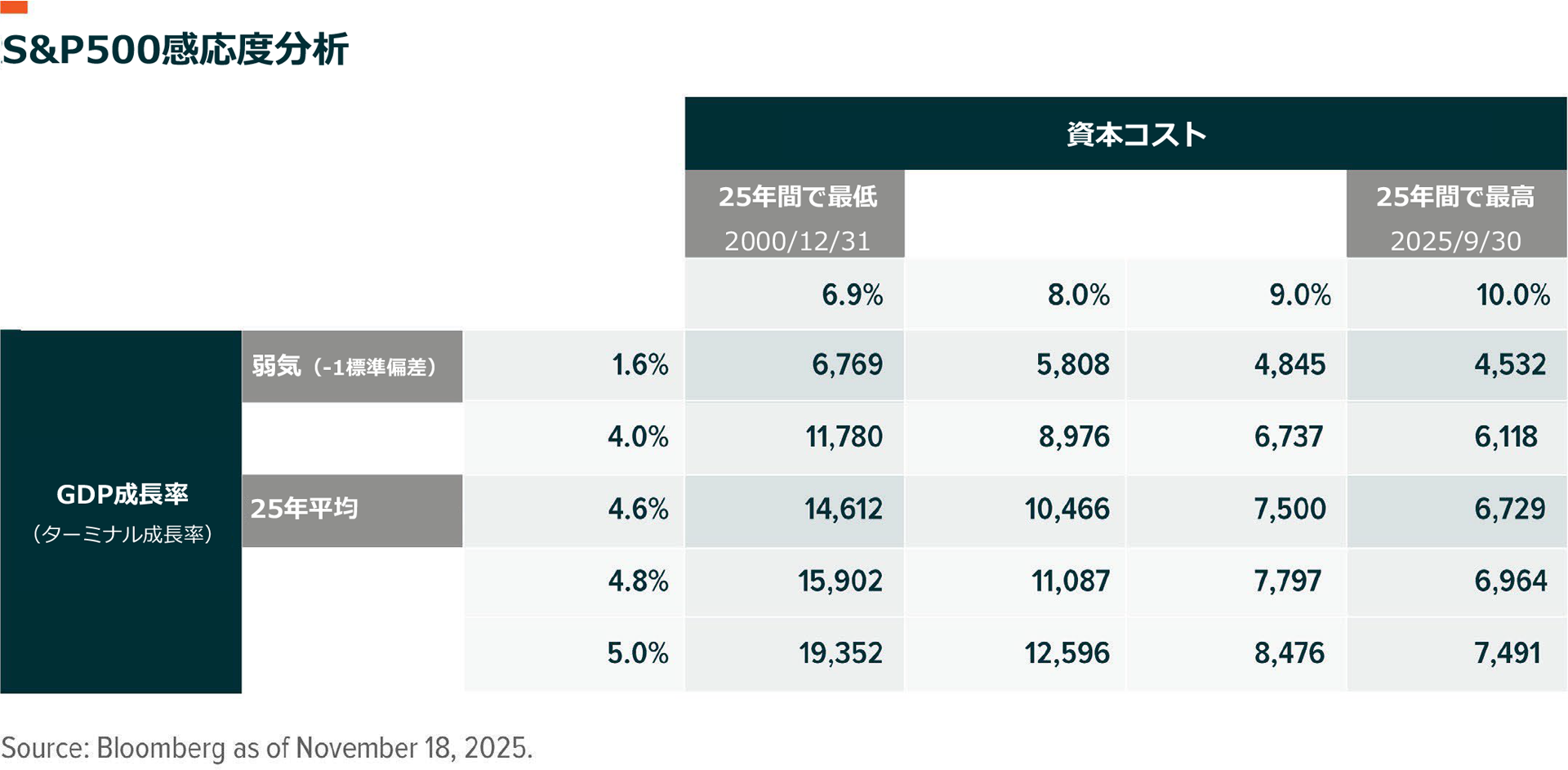 この関係が、利益率と生産性が重要である理由です。売上高の成長が維持され、企業の収益性が自動化によってもう少し向上するならば、織り込まれた想定成長率は妥当です。資本コストが50bp低下し9.5%に近づくならば、S&P500は2026年にさらに上昇する可能性があります。