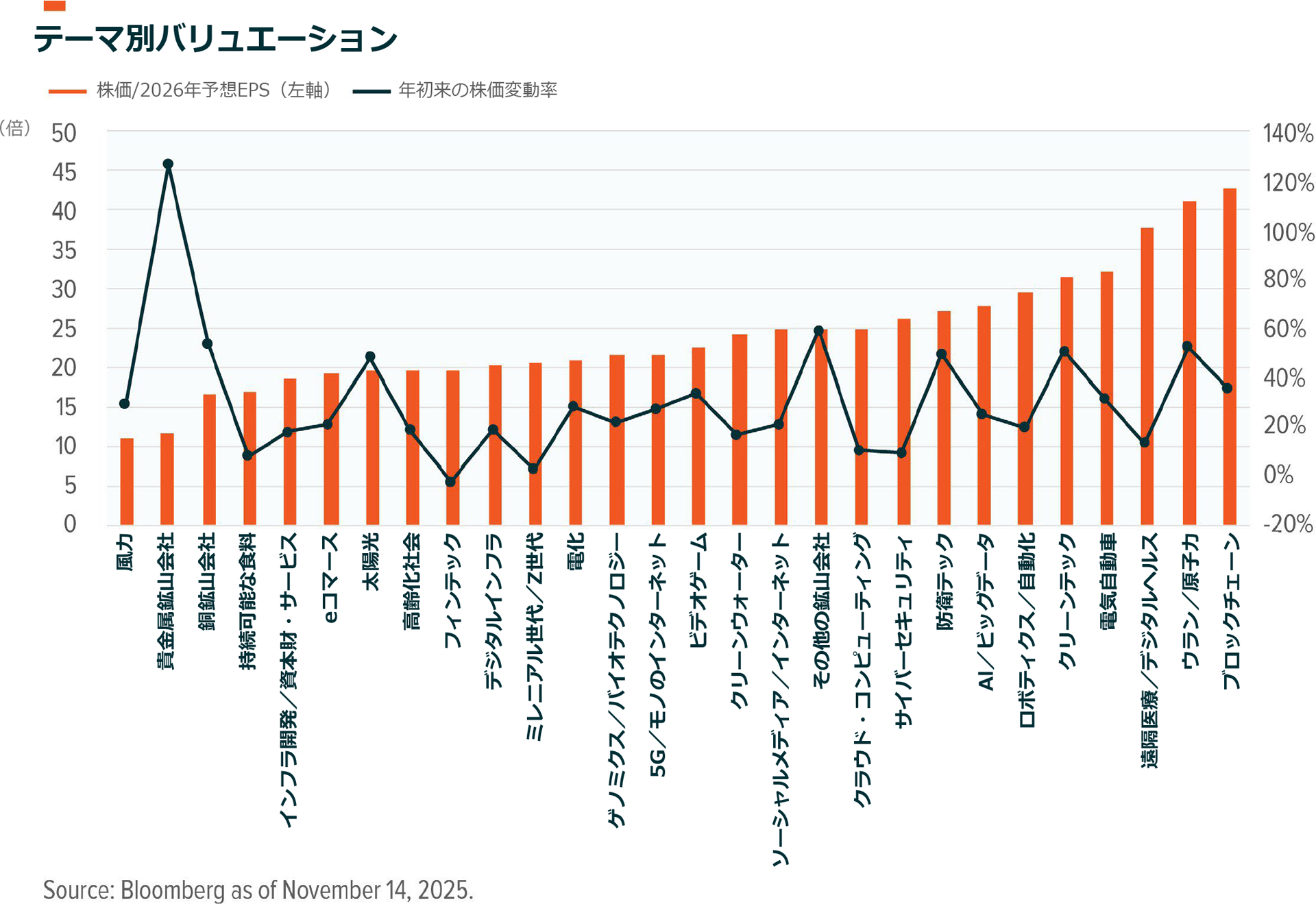 特定のテーマに絞って投資することで、割安なバリュエーションや魅力的な投資タイミングを見いだせる可能性があります。なかでもデジタルインフラやデータセンター関連は、2026年の予想利益を基準にするとS&P500より割安な水準で取引されており、AIやテクノロジー分野への投資比率が低い状況を是正する好機となるかもしれません51。一方、中国が依然として大量の銅を購入していることから、銅鉱山会社の株は関税への懸念で売られました。しかし、2025年10月の貿易合意が維持されるのであれば、これらの銘柄はAI投資や貿易関係改善へのエクスポージャーを妥当な価格で提供する可能性があります。インフラ開発やフィンテックのテーマ、および一部のヘルスケア・テーマはいずれも自動化の進展の恩恵を受けることができます。