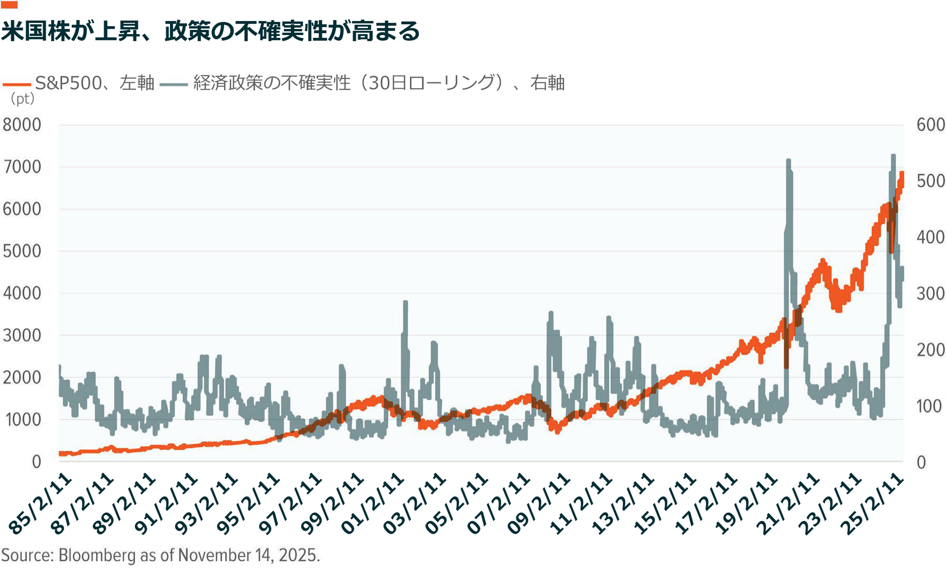 通常、政策の不確実性が平均程度の場合、S&P500の月間リターンは1%をやや上回る程度です52。政策の不確実性が低下すると、同リターンは5%になります。政策の不確実性が1標準偏差高まると、月間平均リターンはゼロになり、それ以上高まるとマイナスになります。しかし、2025年は政策の不確実性が高まったにもかかわらず、株式は上昇しました。