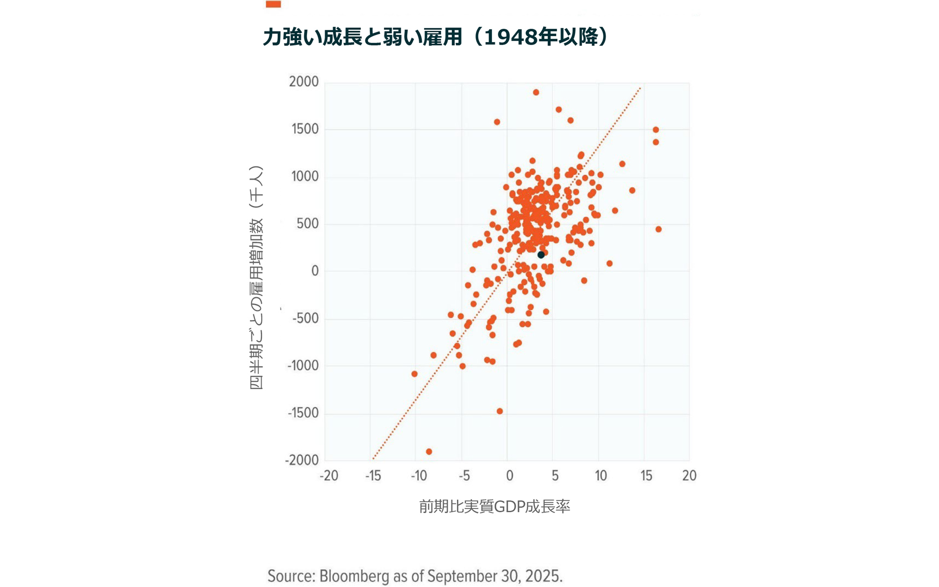 米国の2025年第2四半期GDP成長率は堅調でしたが、雇用の伸びは低迷しました。このような乖離が起きるのは異例です。通常、前期比3.8%の実質GDP成長率は約45万人の新規雇用に相当します18。雇用統計が下方修正された後、米国経済の新規雇用はわずか約11万人にすぎませんでした。この乖離の要因としては「無雇用、無解雇」経済、移民の減少、テクノロジーによる代替などが挙げられます19。