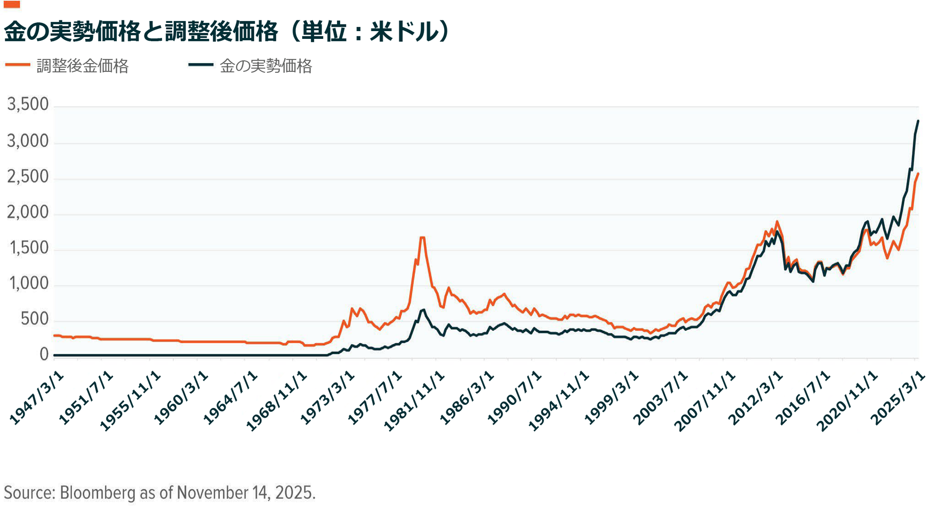 もう1つの相反する事象は、株式リターンが高い状況での金価格の力強い上昇です。伝統的に、金は市場のボラティリティが高まる局面における安全資産として機能してきました。米国の貿易、債務、経済成長への懸念が高まる中、一部の中央銀行が米ドル建て資産から分散投資するために金の保有量を増やし、金は歴史的なインフレ調整後レンジを大きく超えて上昇しました25。