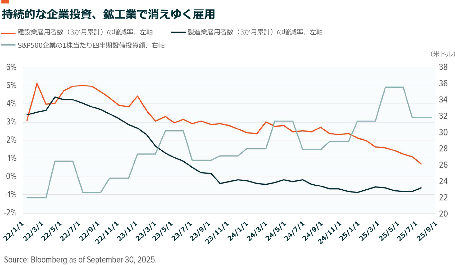 このサイクルはAIと自動化への投資によって推進されてきましたが、過去3年間で設備投資が17%増加したにも関わらず、米国の建設業と製造業の雇用は減少しています26。問題は、巨額な投資と米製造業を強化しようとする政策の後押しを受けて、雇用が改善するかどうかです。