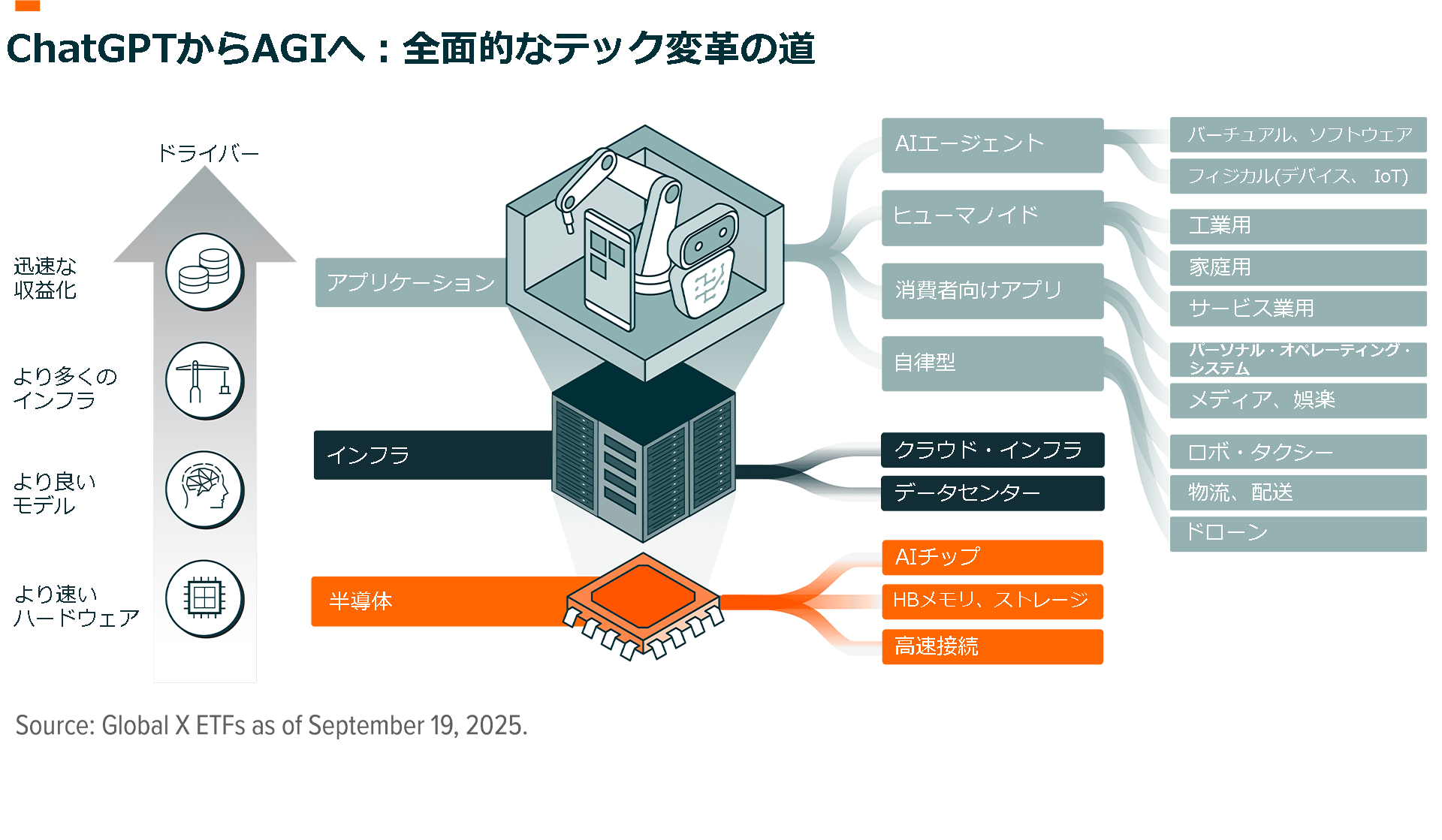 AGIを実現するには、画像処理装置(GPU)、データセンター、電力システムに数兆ドルの投資が必要になる見込みです1。このインフラの拡大につれて、より高性能なモデルが可能になり、AIエージェントとアプリケーションの創出が進み、半導体からソフトウェアに至るまで、技術スタックが大きく変化します。投資家にとって、AGIへと向かう道に沿って、AI半導体やデータセンター・インフラ、インテリジェント・アプリを通じたエクスポージャーをとることは、成長を捉え、社会の構造的な変化を回避するために不可欠となる可能性が高いでしょう。