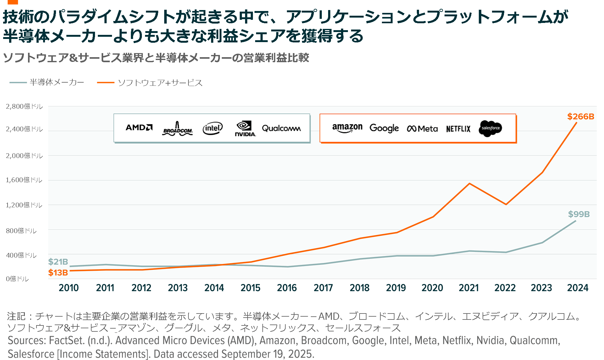 半導体とハードウェアが不可欠であることに変わりはないですが、AIの波が広がるにつれて、経済の重心が移動する可能性があります。これまでの技術サイクルによれば、プラットフォームが成熟すると、アプリケーション分野が最終的に最も大きな利益を得ています10。スマートフォンが半導体を上回る何兆ドルものソフトウェア価値を生み出したように、AIの長期的な利益の源泉は、人工知能を収益化するアプリケーションとエージェントのエコシステムにある、とグローバルXは考えています。これは、投資家がAIのスーパーサイクルに関するポジショニングを検討する上で非常に重要な要素です。