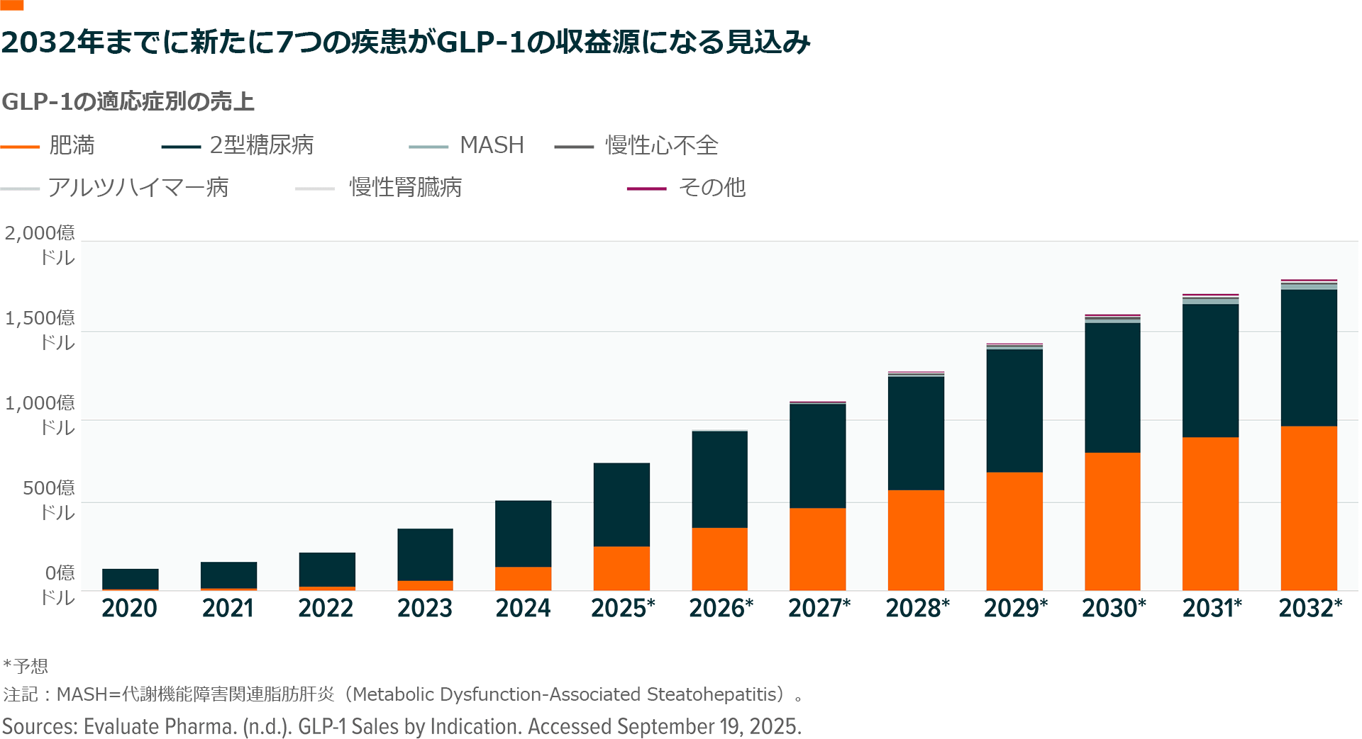 2型糖尿病と肥満以外に慢性腎臓病、心血管疾患、アルツハイマー病など7つの新たな適応症が加わることで、GLP-1の売上は2020年から2032年までに10倍近く増加し、1,830億ドル(28.4兆円)に達する見込みです3。