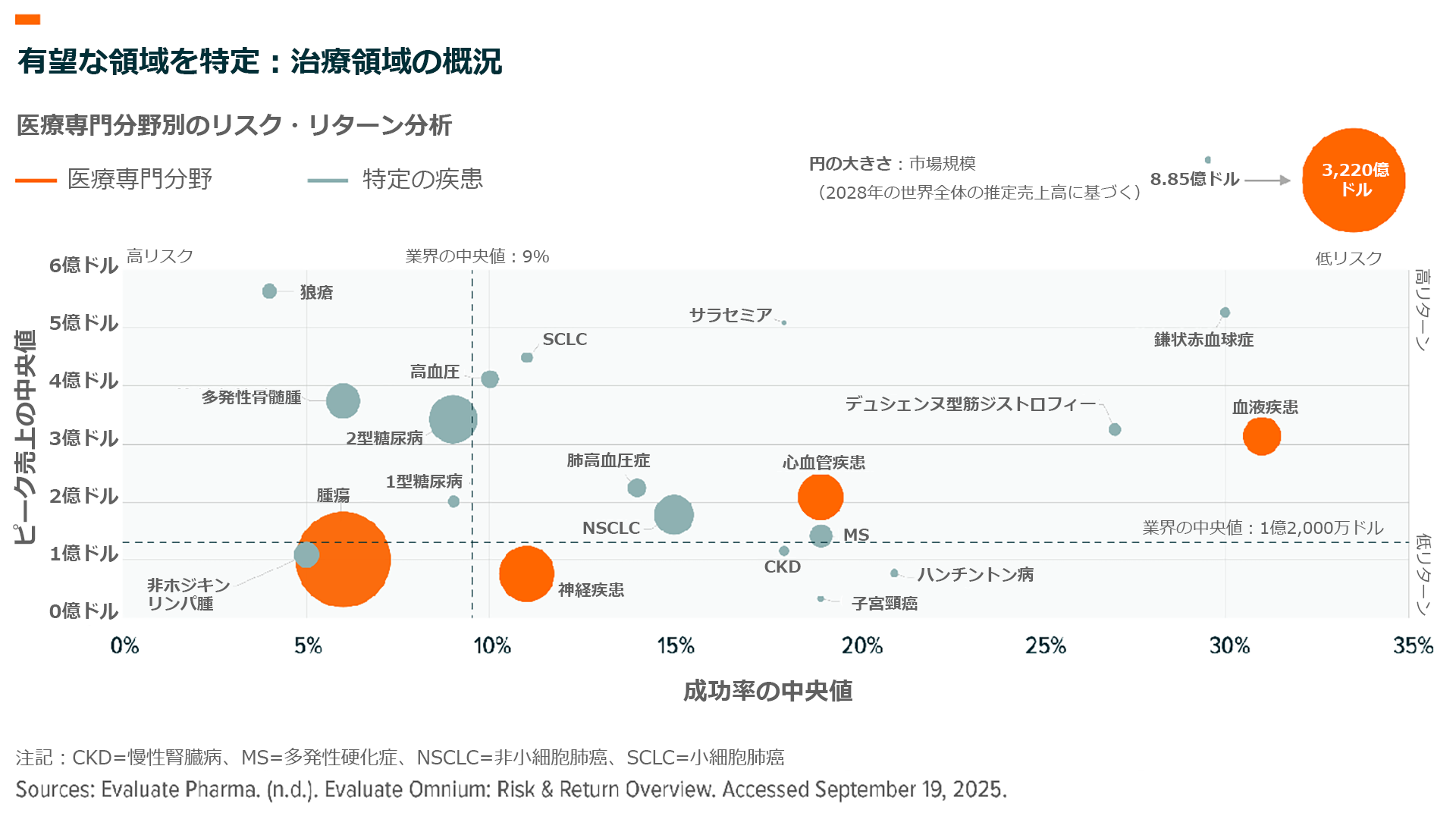 しかし、どの治療分野も同じように成功を収めているわけではありません。リスクとリターンの状況は専門分野によって大きく異なり、生物学的な複雑さ、患者数、商業的な可能性の違いを反映しています。