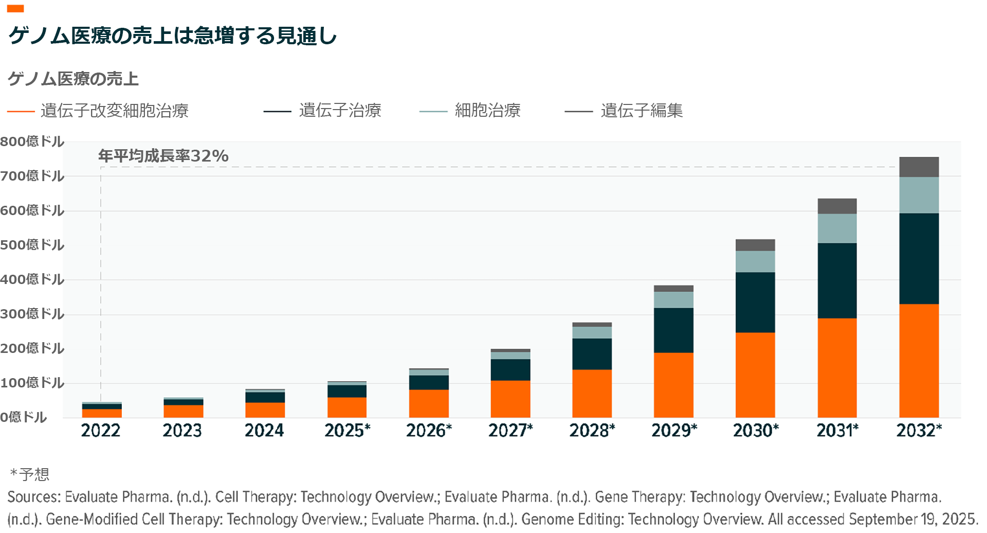 かつては高リスクの研究分野であったゲノム医療は、商業的に実現可能なヘルスケアの土台へと成熟しつつあります。遺伝子治療、細胞治療、遺伝子改変細胞治療、遺伝子編集を含むこの分野の売上は、2032年までに年間約800億ドル(12.4兆円。医薬品全体の売上高の約5%)に達すると予想されます5。