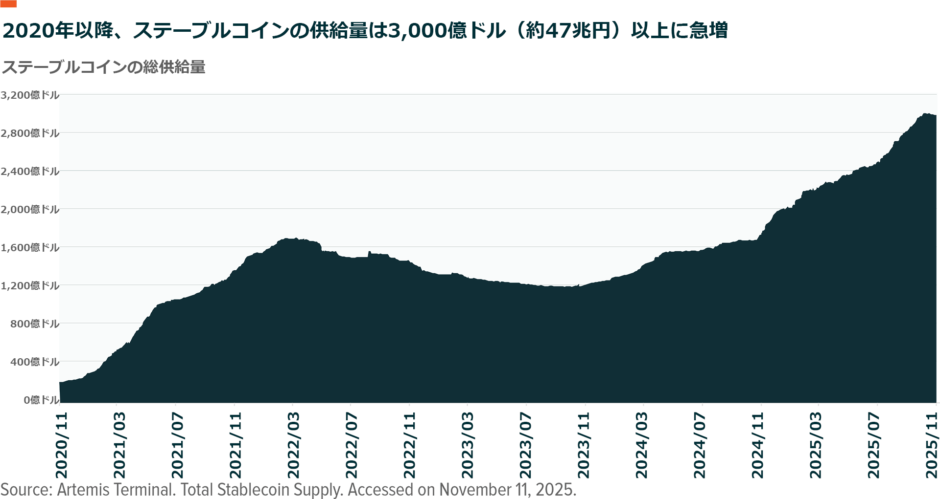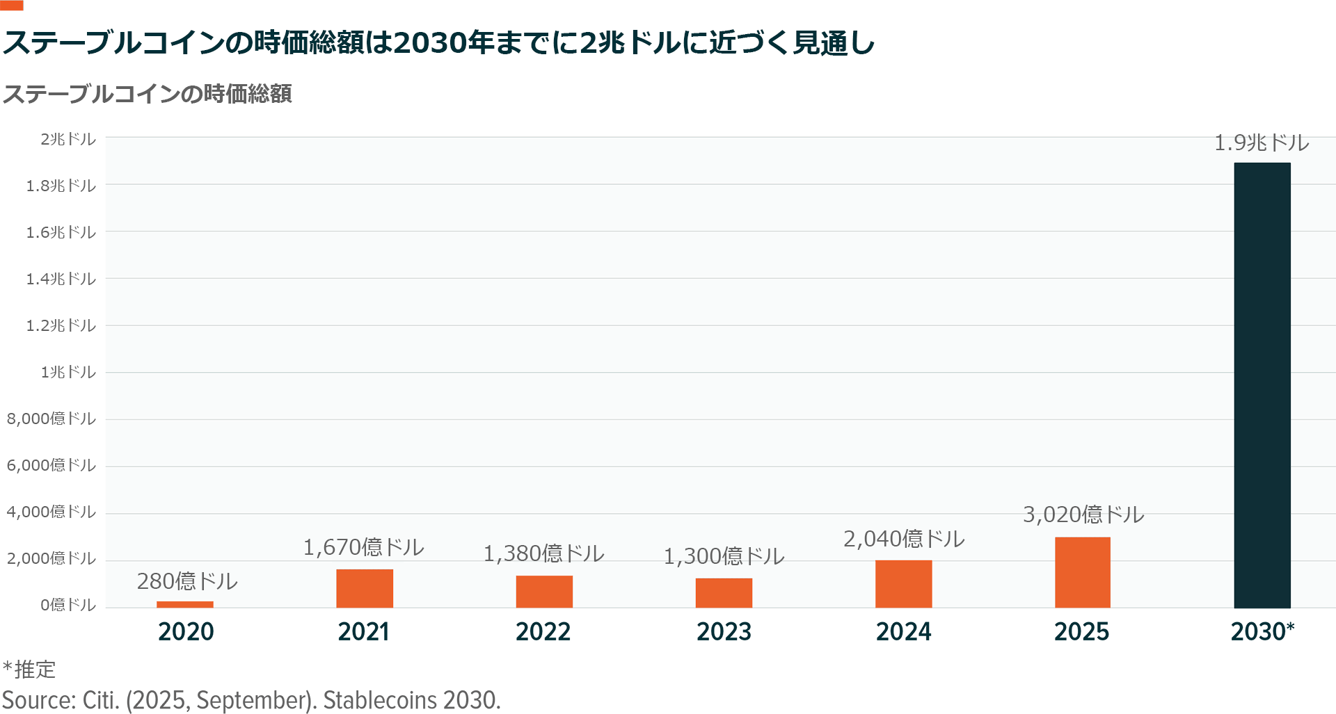 ステーブルコインの推定市場規模は巨大で、導入が進むにつれて急速に拡大しています。世界の支払、送金、貯蓄のほんの一部でもステーブルコインに移行するだけで、その潜在的な取引量は数兆ドルに達する可能性があり、イノベーションの好循環が始まります。ステーブルコインの発行総額は2025年11月12日時点で約3,000億ドル(約47兆円)ですが、2030年までには1.9兆ドル(約300兆円)を超えると推定されています9。
