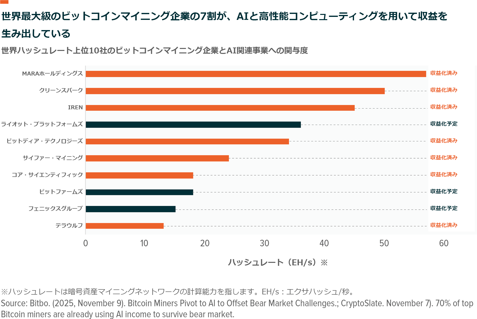 このように変化する状況の中で、規模やインフラを選択できることが戦略的な差別化要因になりつつあります。より規模が大きい採掘企業は資本を集め、半導体チップの割り当てを確保し、長期的な企業契約を結べるようになり、その結果、企業統合を推進し、売上を加速度的に伸ばしています。また、採掘企業は電力にもアクセスできます。これは、AIをより大規模に構築する上で電力がボトルネックになっていることを考えると戦略的に有用です。