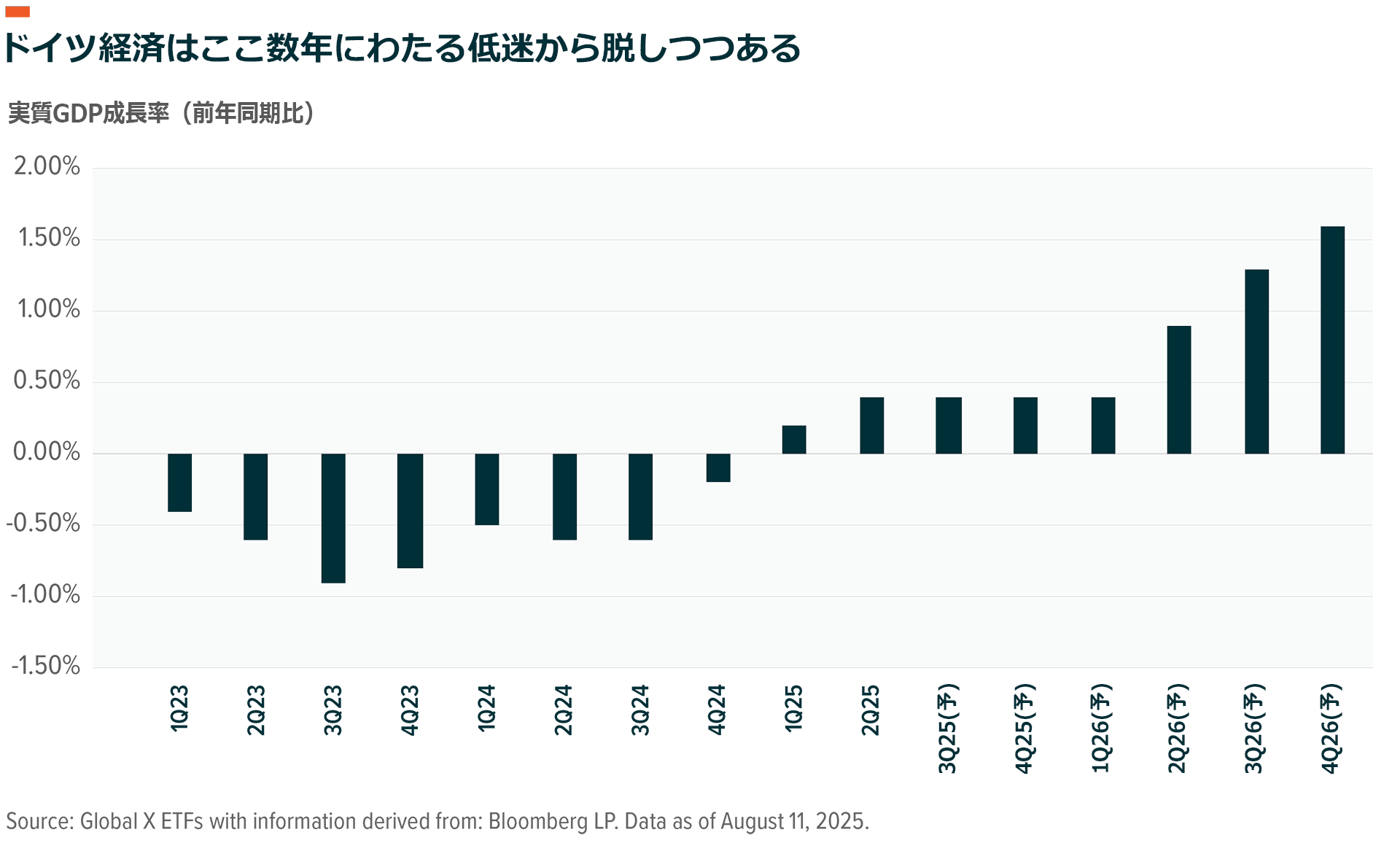 グローバルXでは、ドイツの株式市場が構造的な再評価の転換点を迎えていると考えています。大規模な財政刺激策、経済指標の改善、好ましいバリュエーションの組み合わせが、魅力的な投資機会を提供する可能性があります。