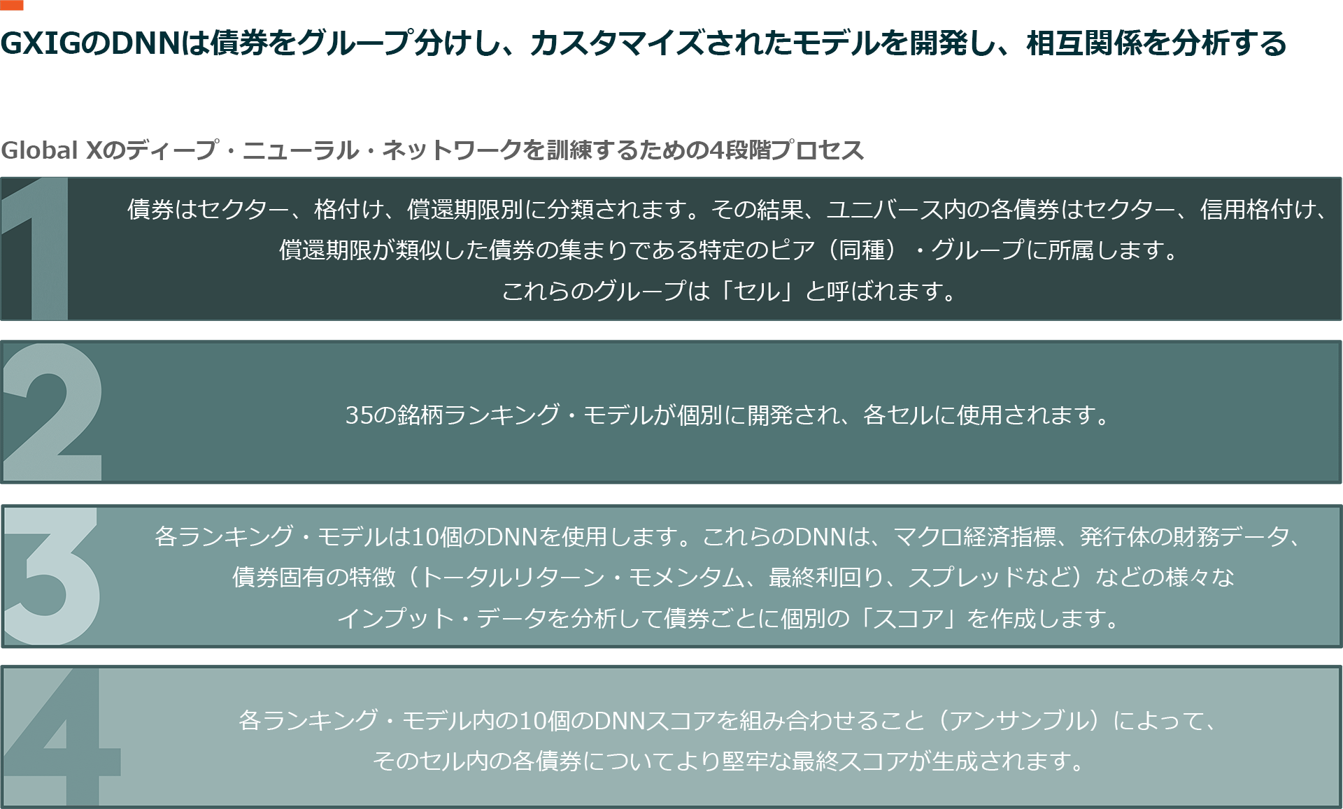 グローバルX 米ドル建て投資適格社債 ETF(GXIG)はAIの力を取り込み、この萌芽的テクノロジーを活用します。具体的には、GXIGは債券分析に多面的なアプローチを取り入れ、定量的ファクター・モデルとディープ・ニューラル・ネットワーク(DNN)を組み合わせて投資適格社債のユニバース全体にわたって銘柄を評価しています。GXIGのポートフォリオ構築に関する最終的な意思決定は人間のポートフォリオ・マネジャーが行いますが、AIを活用することで大量のデータを迅速かつ効率的に処理することが可能になり、マネジャーの意思決定に役立ちます。
